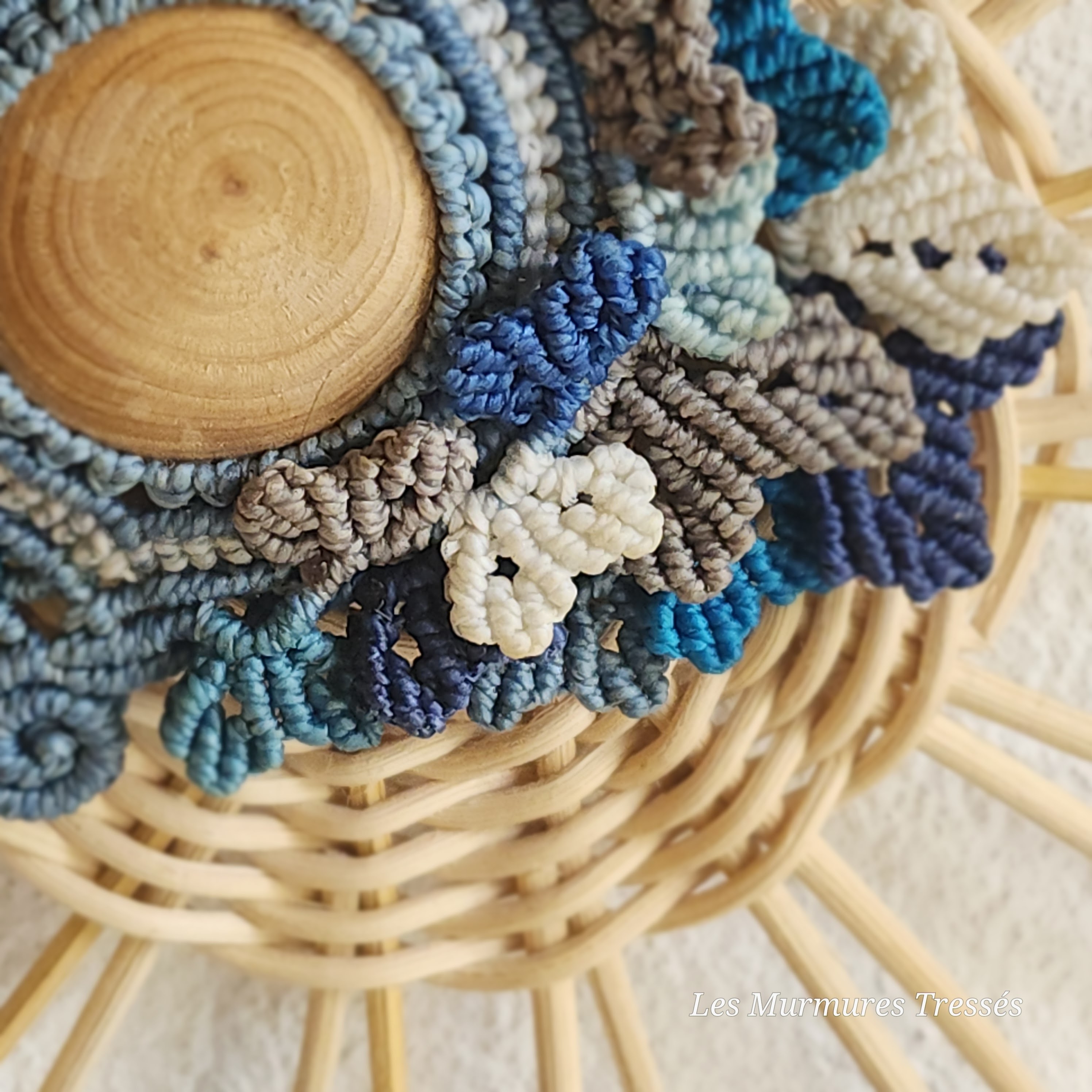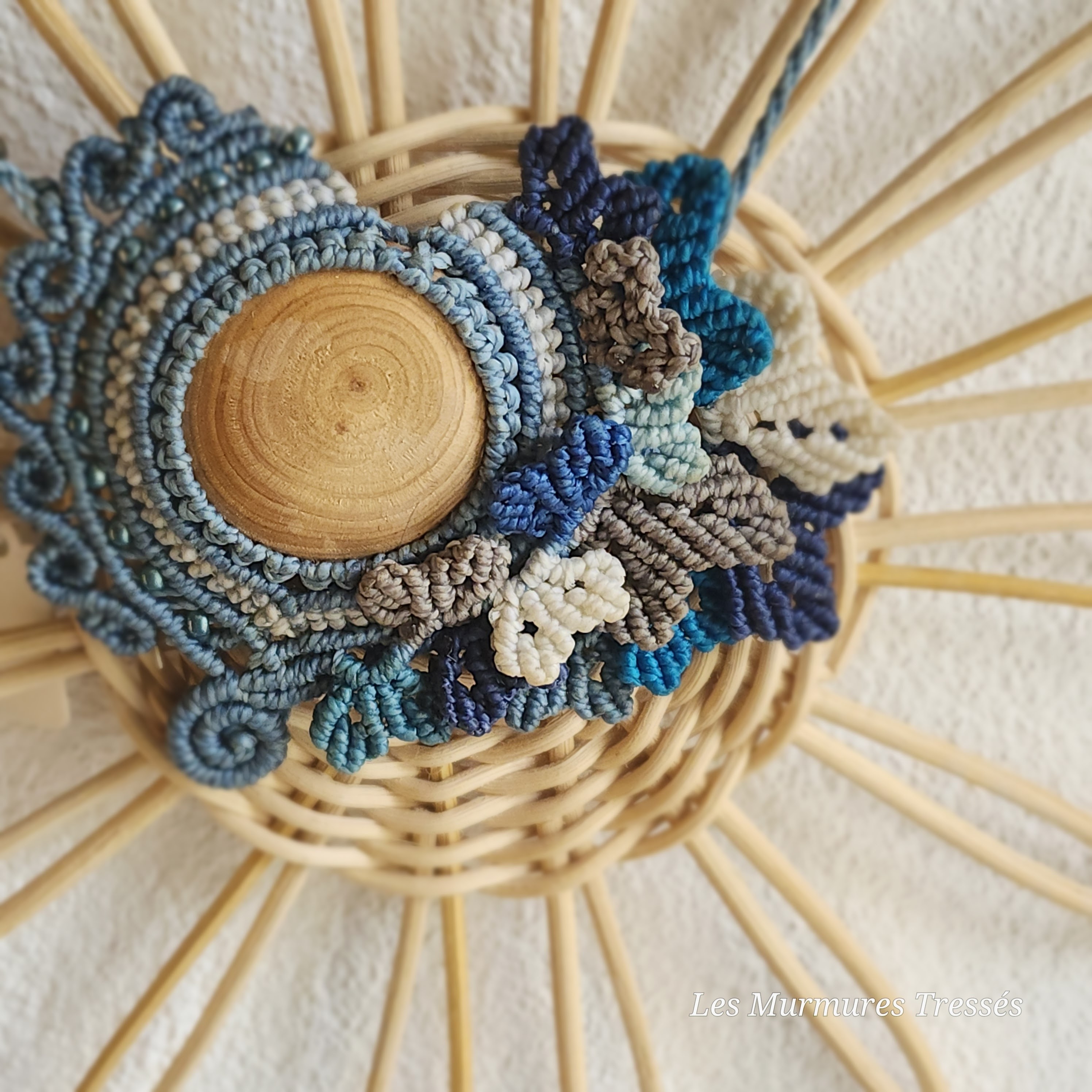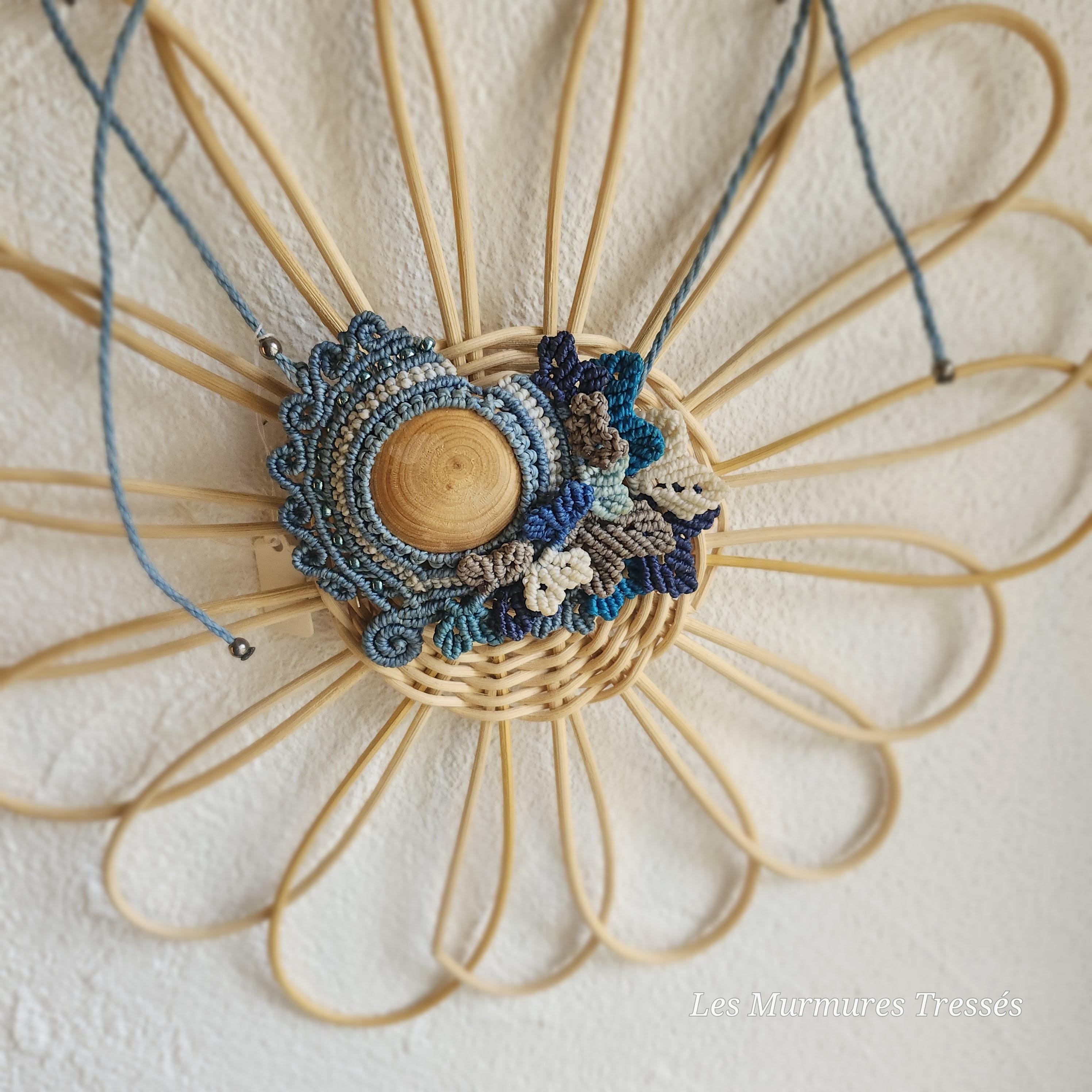Les fils de micro-macramé dansent autour du cabochon, mêlant bleu canard, turquoise, sable et lin.