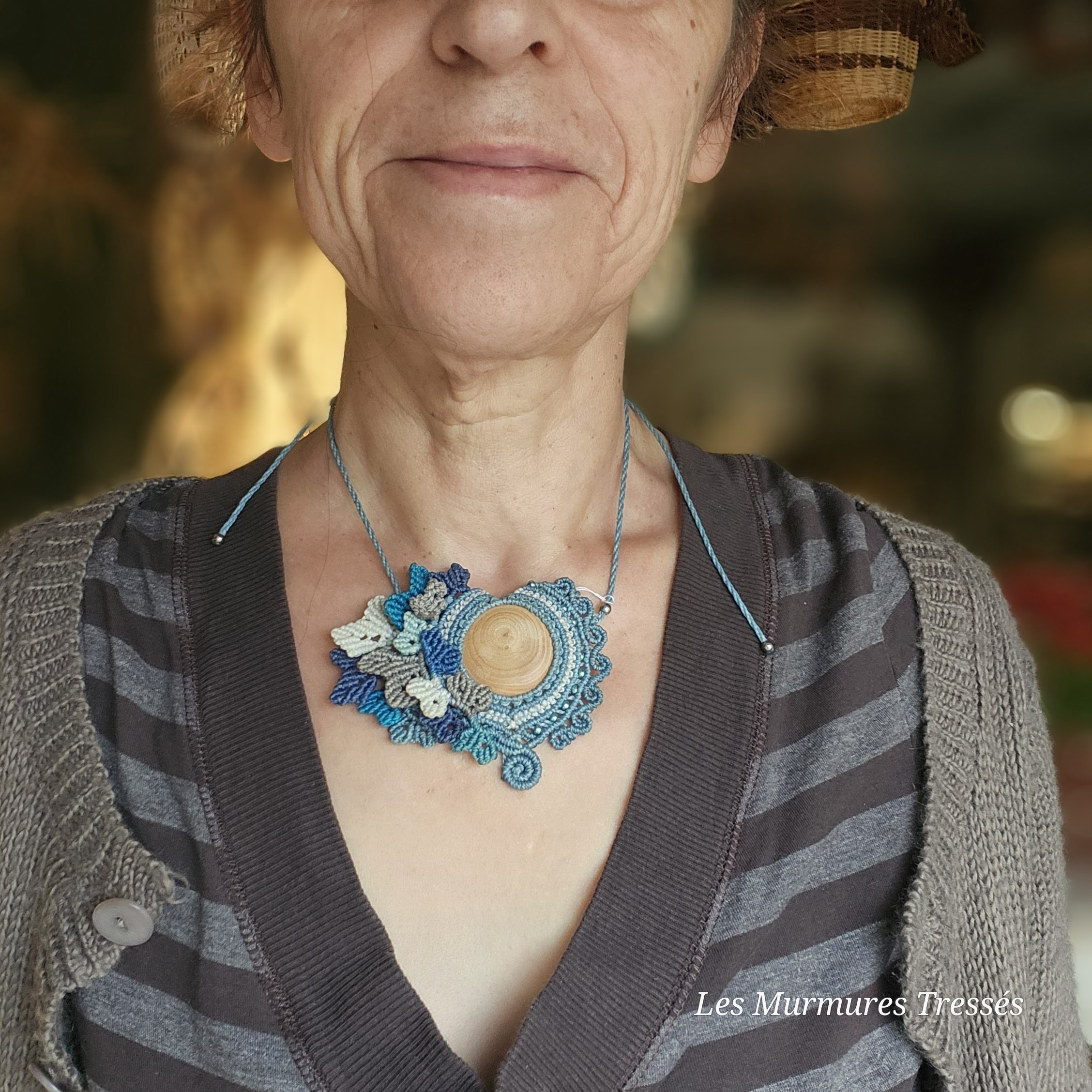 Ce collier Fleur de Bois associe la chaleur du bois à la fraîcheur des bleus océaniques.