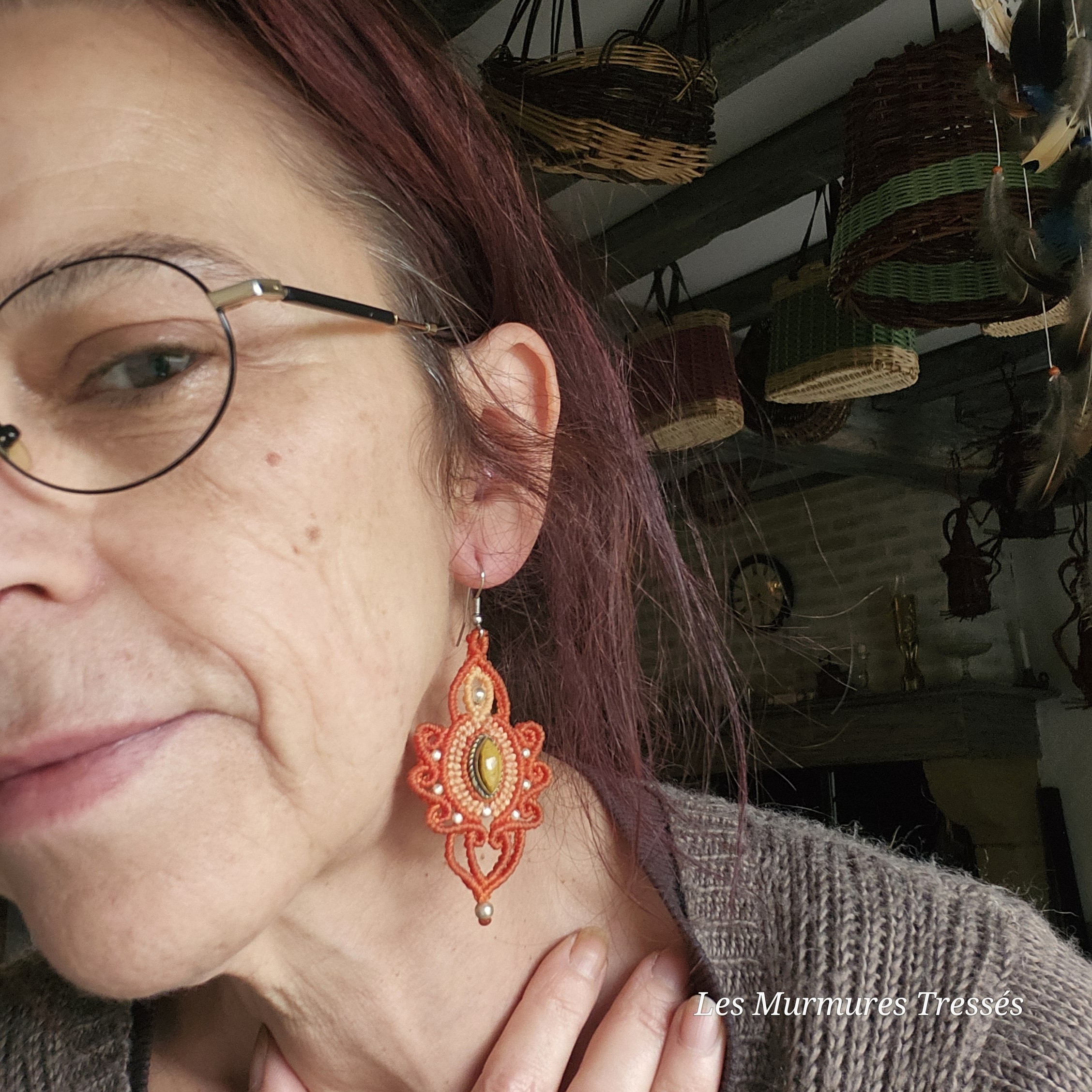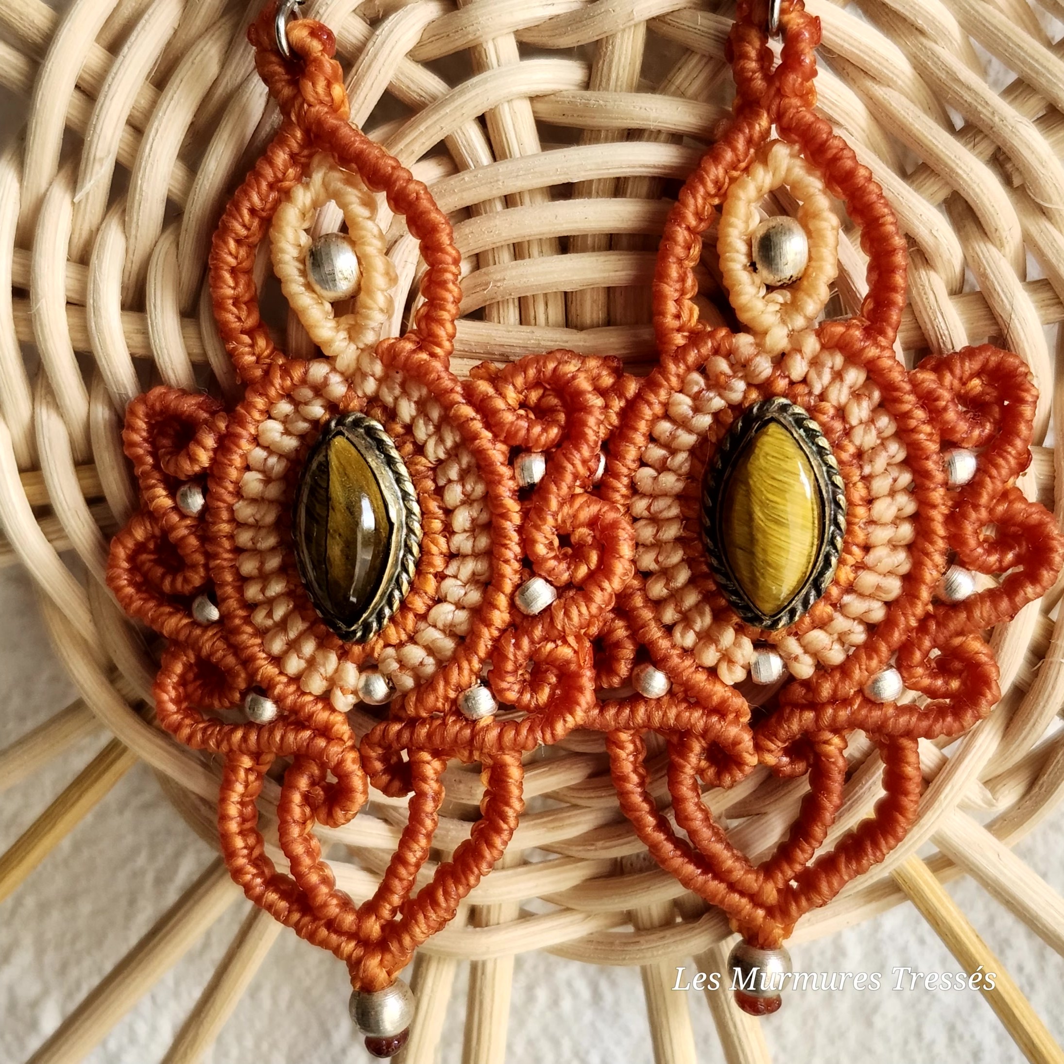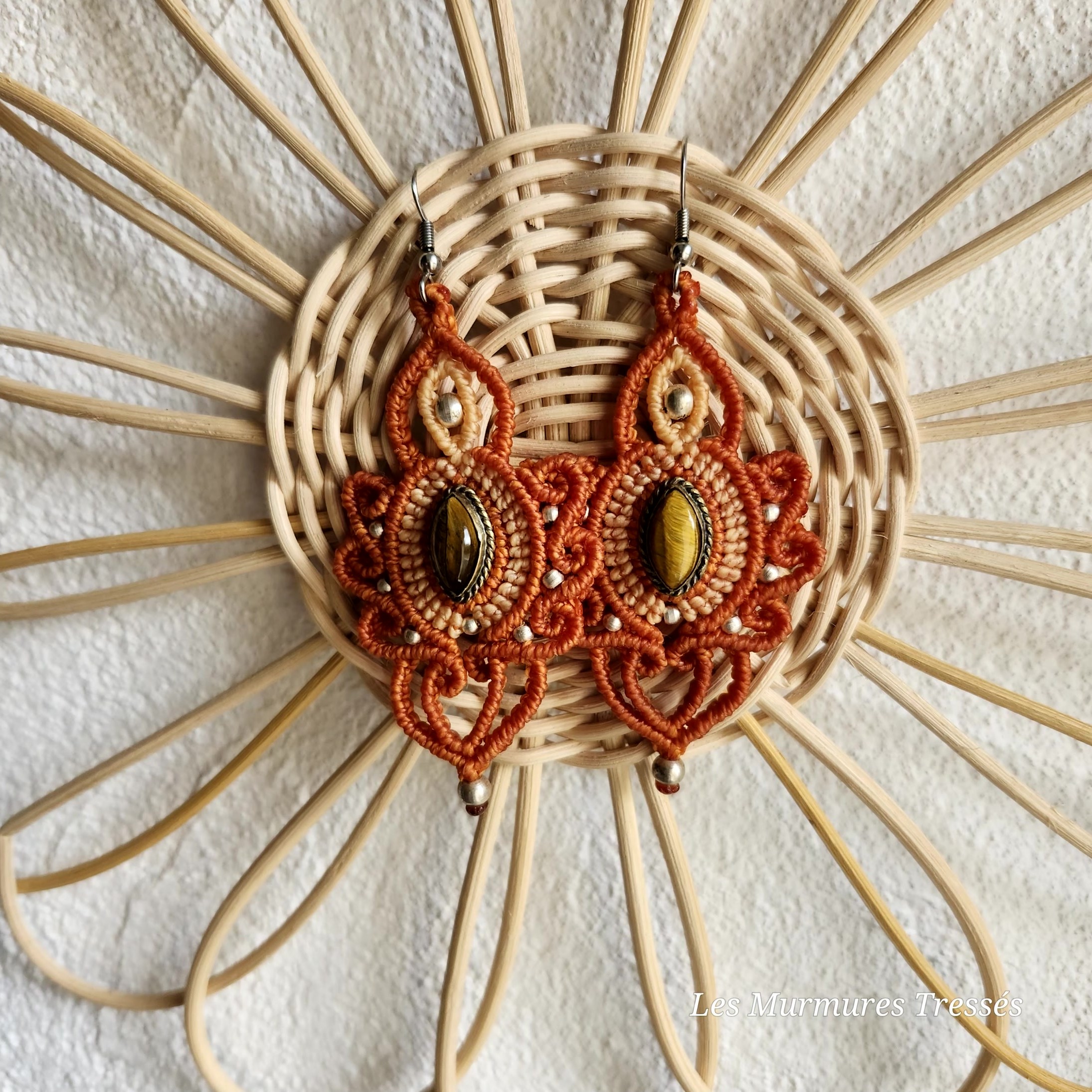 Les « Éclat du Soleil » capturent la vitalité de la lumière dans un tissage orangé et saumon, relevé par l’éclat protecteur d’un œil de tigre serti.