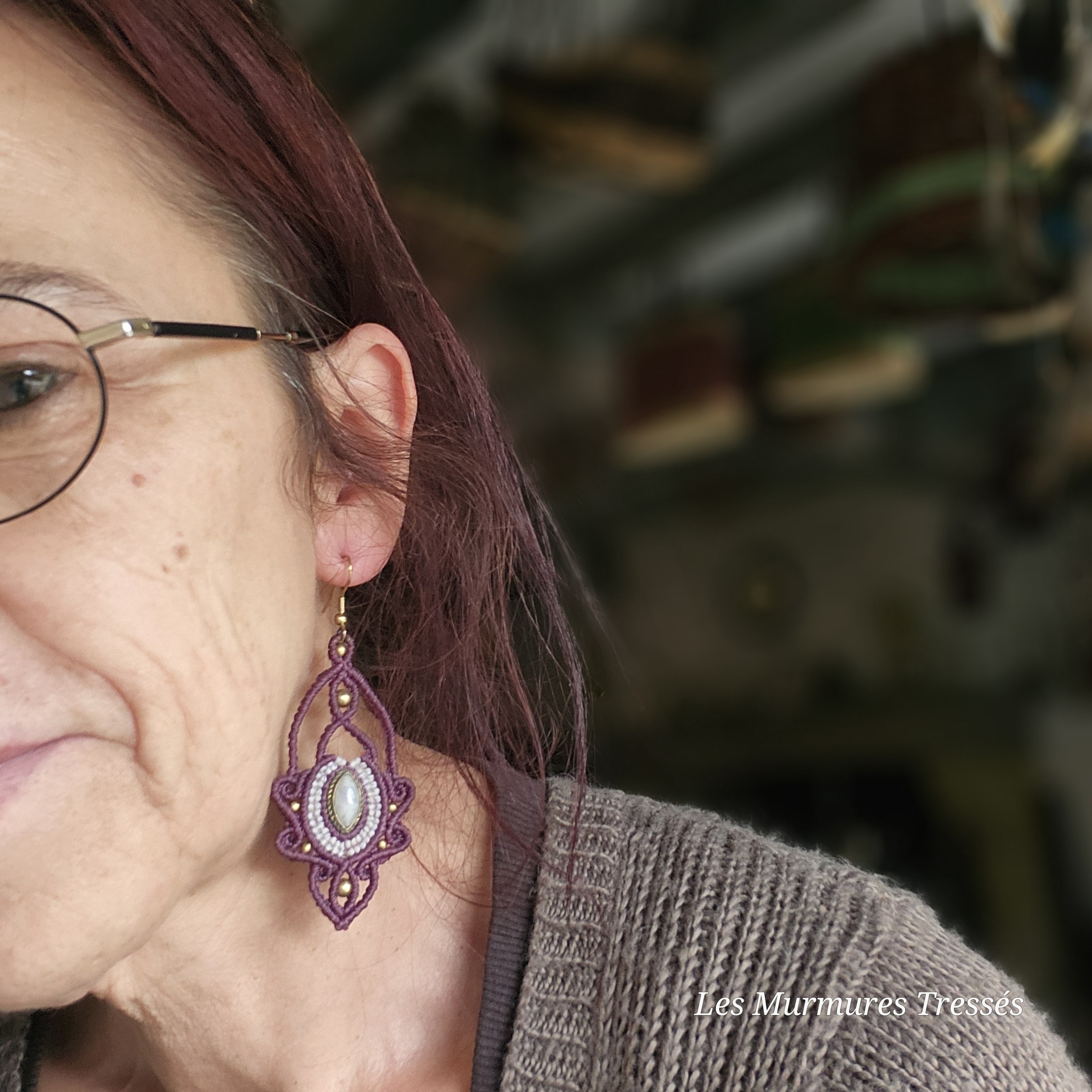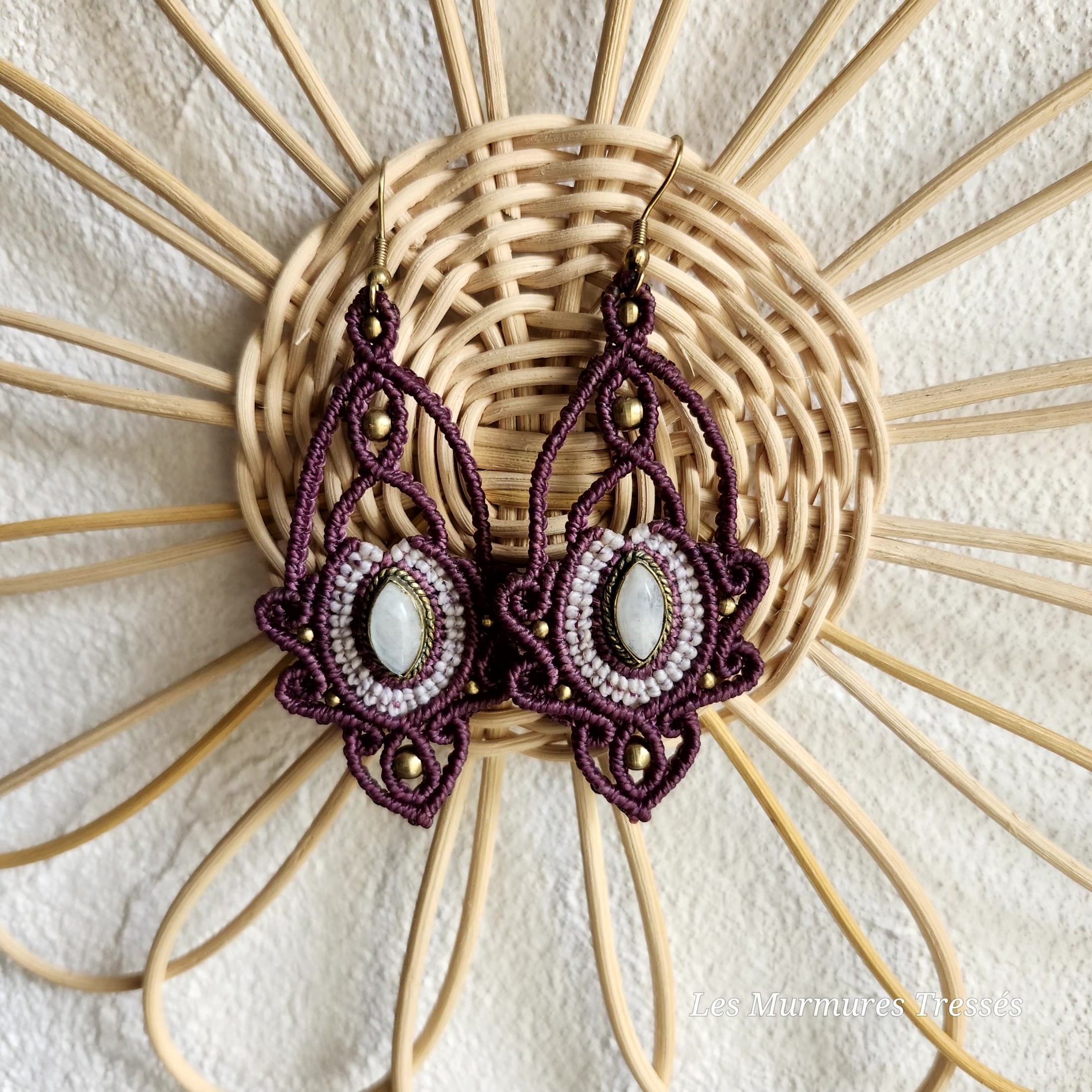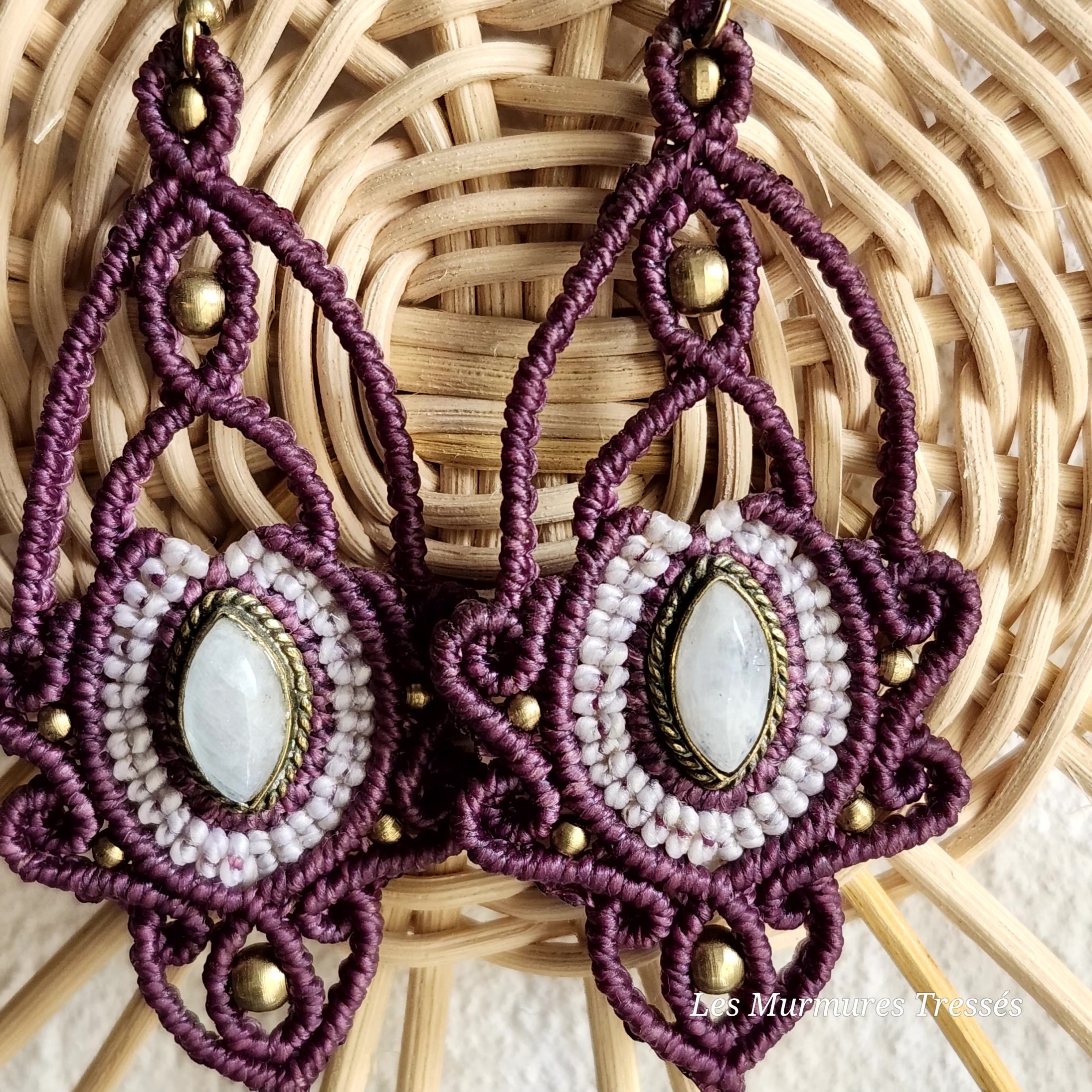 Les « Voile de Lune » dévoilent un tissage délicat en micro-macramé, mariant le fil prune profond au blanc nacré, comme un clair de lune sur un ciel d’été.