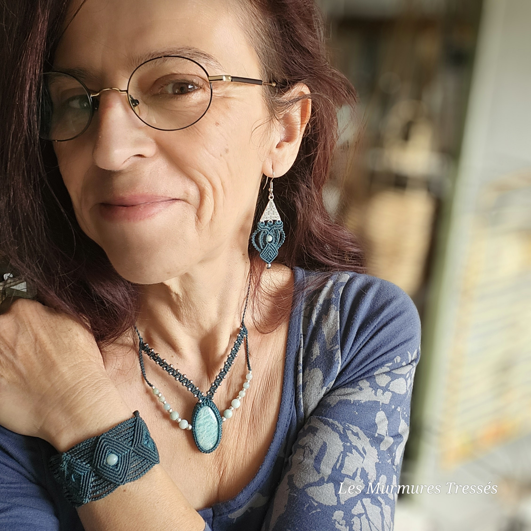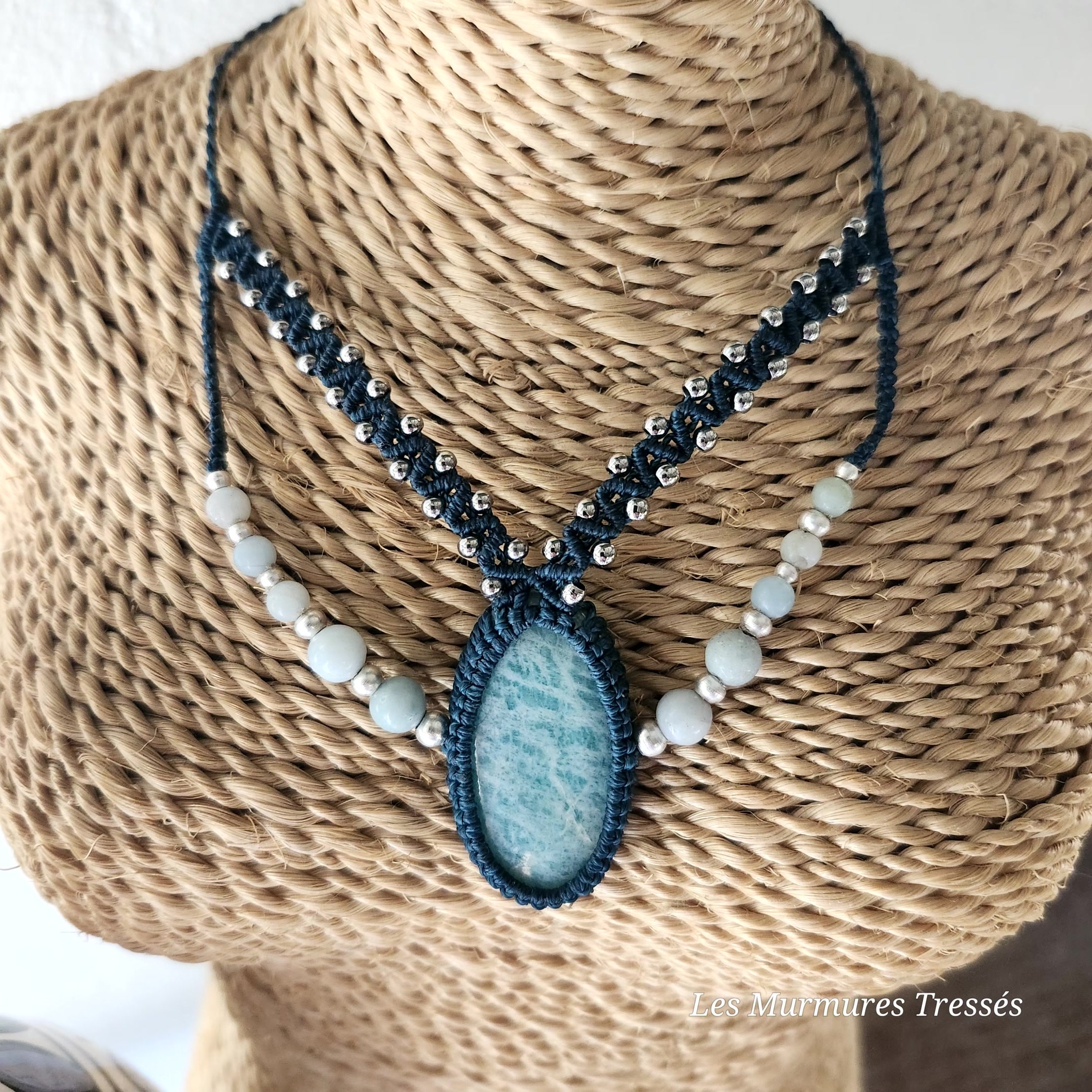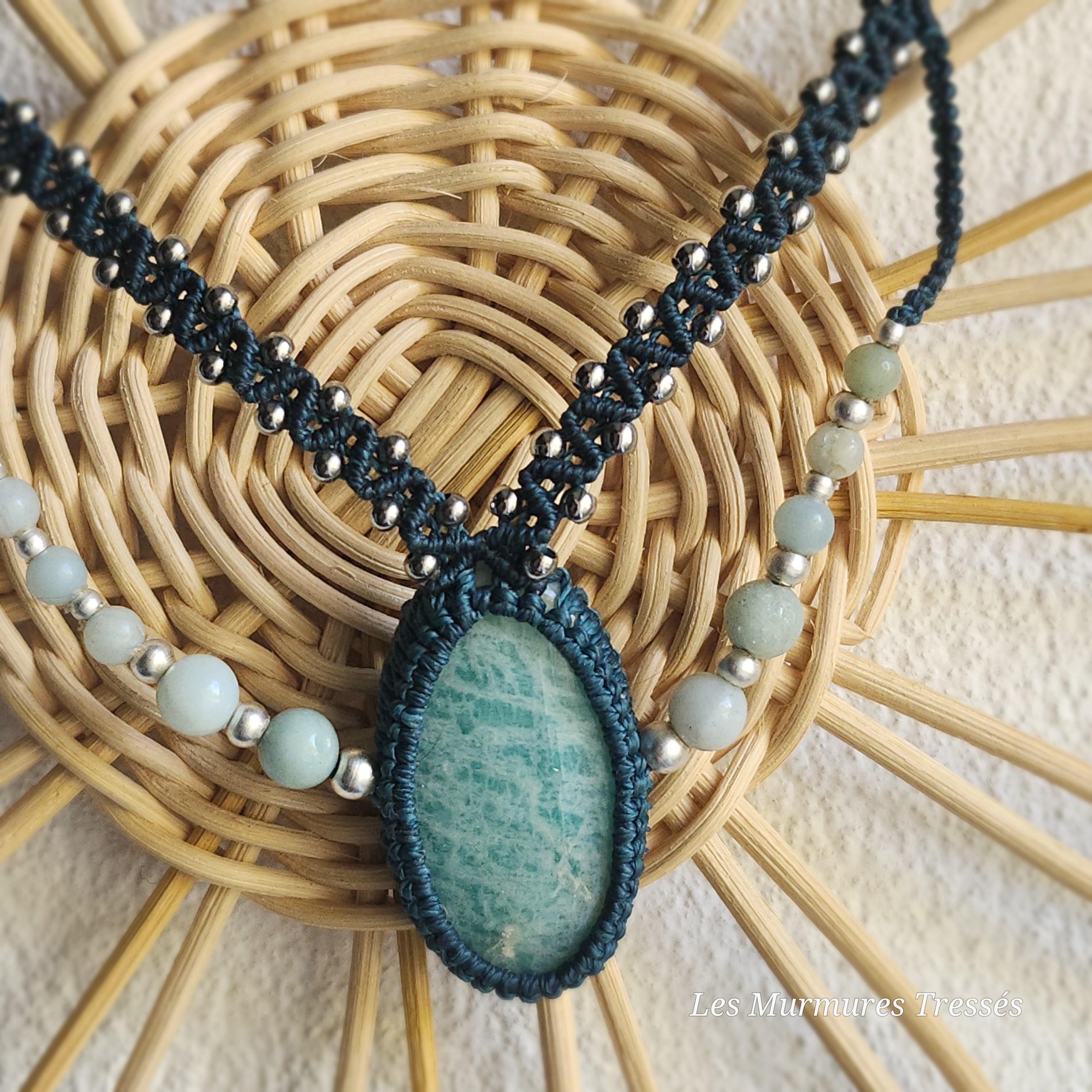 Ce collier fait main tissé patiemment en micro macramé, met en lumière une amazonite naturelle,