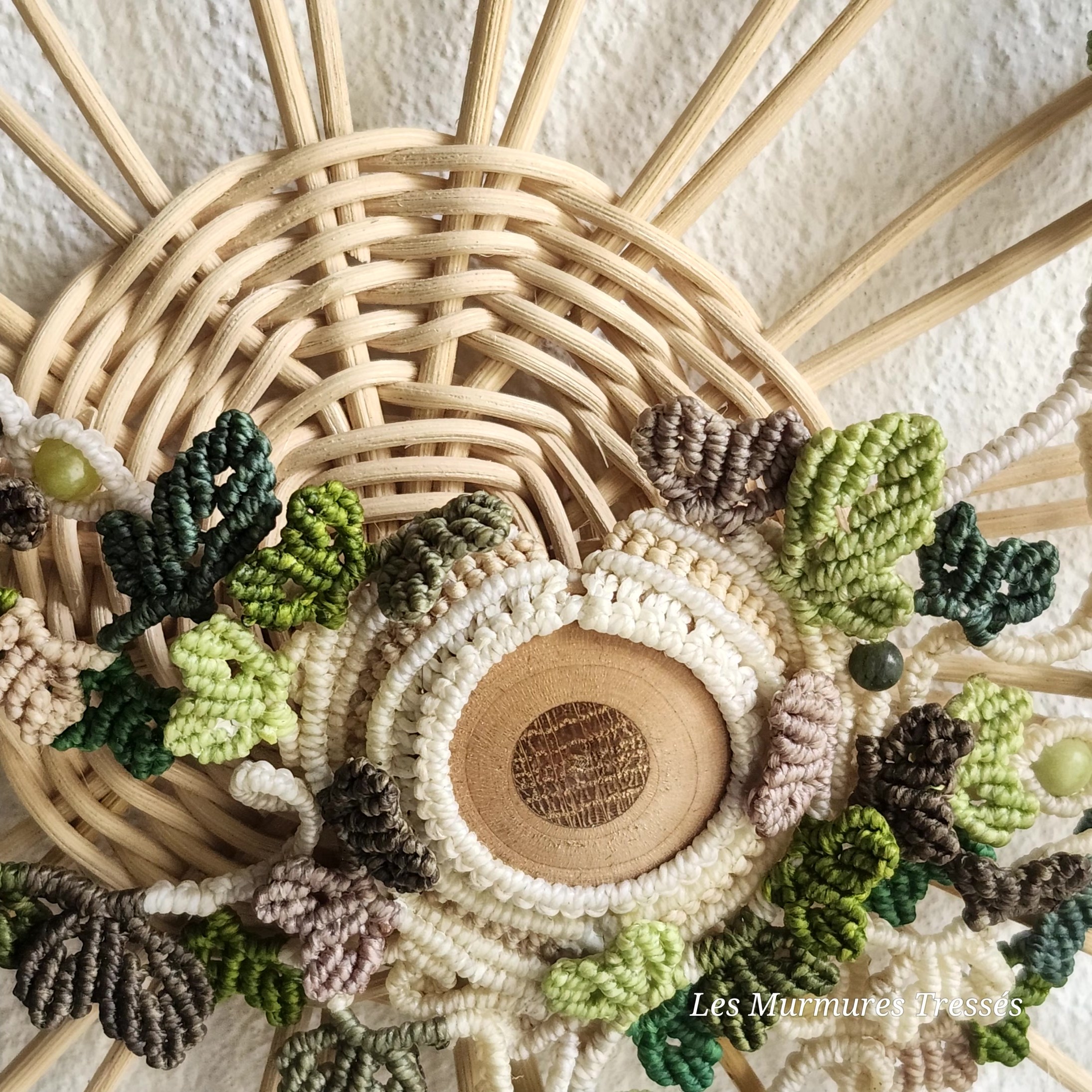 Son cabochon de bois, entouré de fils écrus et beiges, s’anime d’un délicat tressage orné de petites feuilles vertes