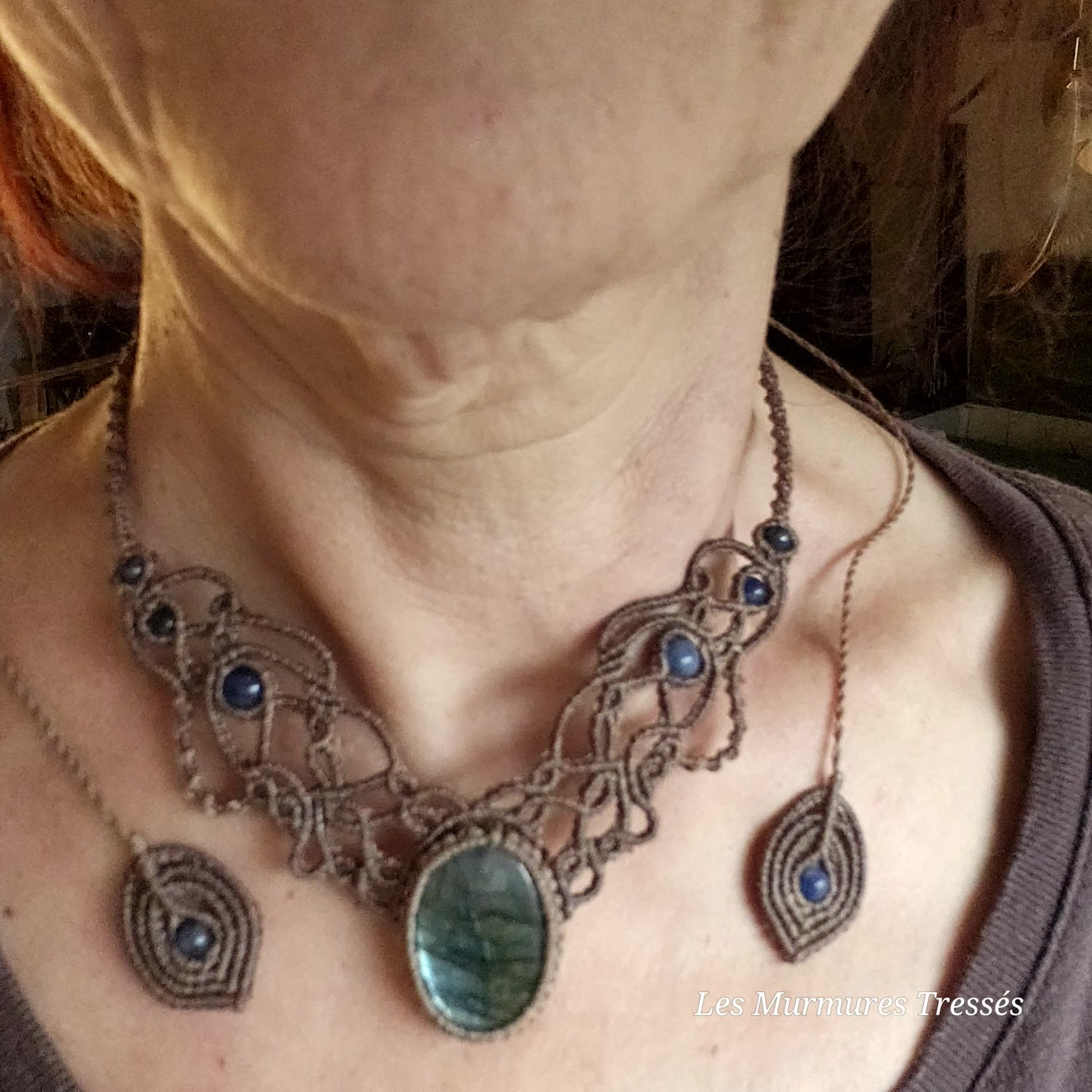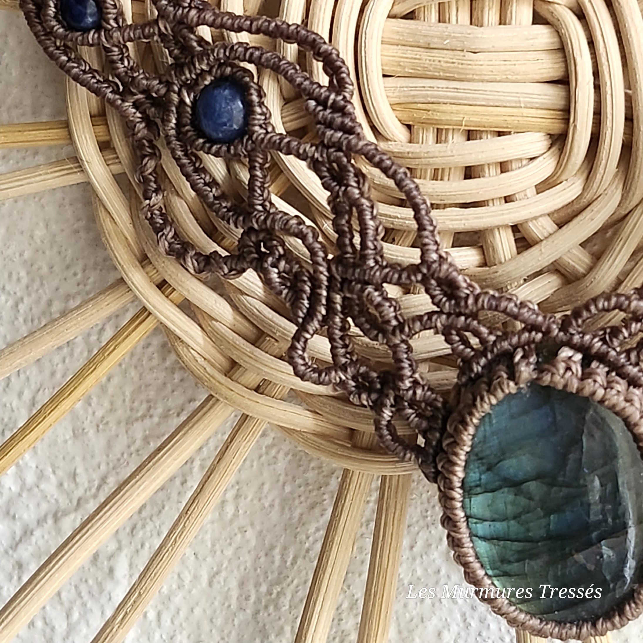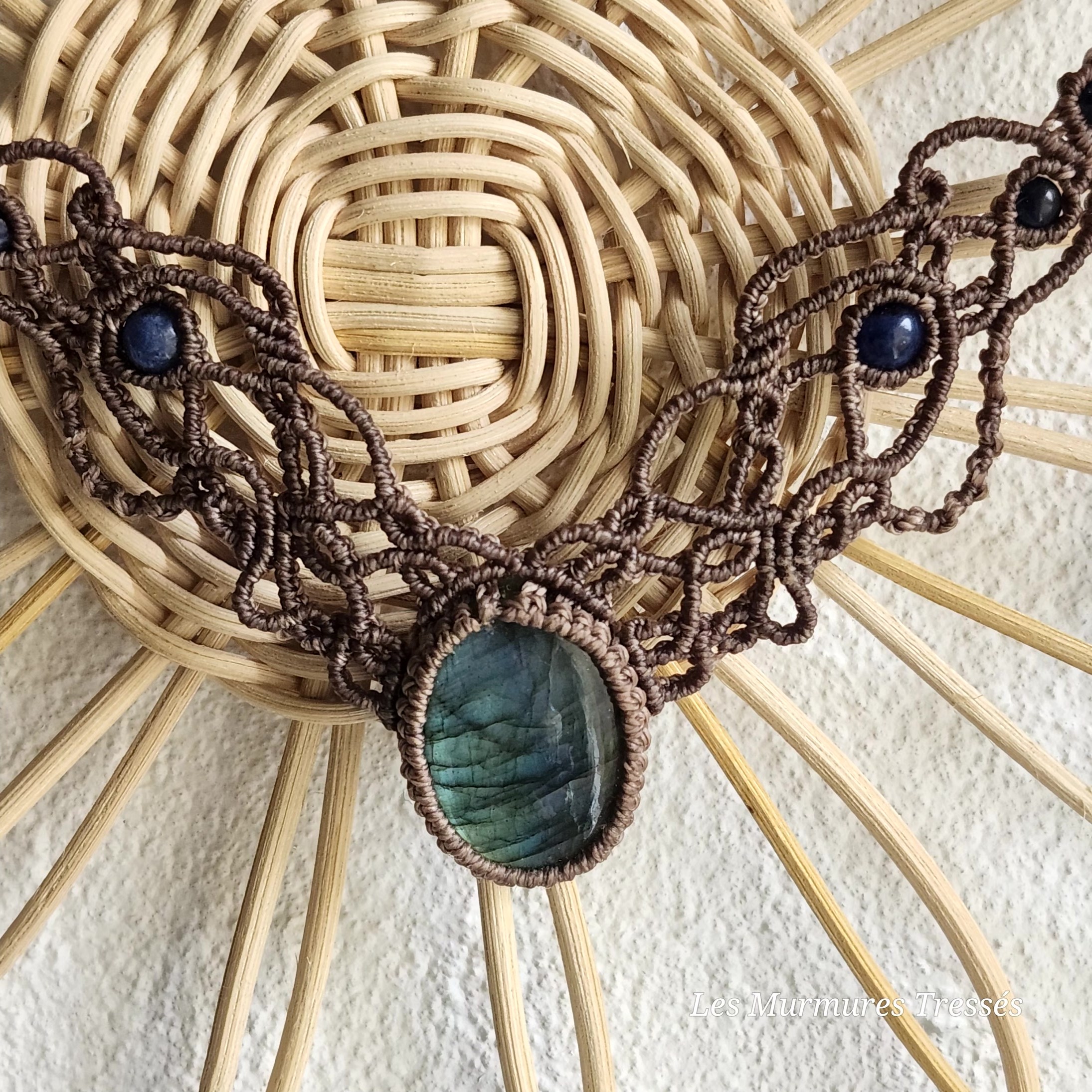 Ce collier en micro-macramé mêle les teintes chaudes du beige foncé à l’éclat changeant de la labradorite.