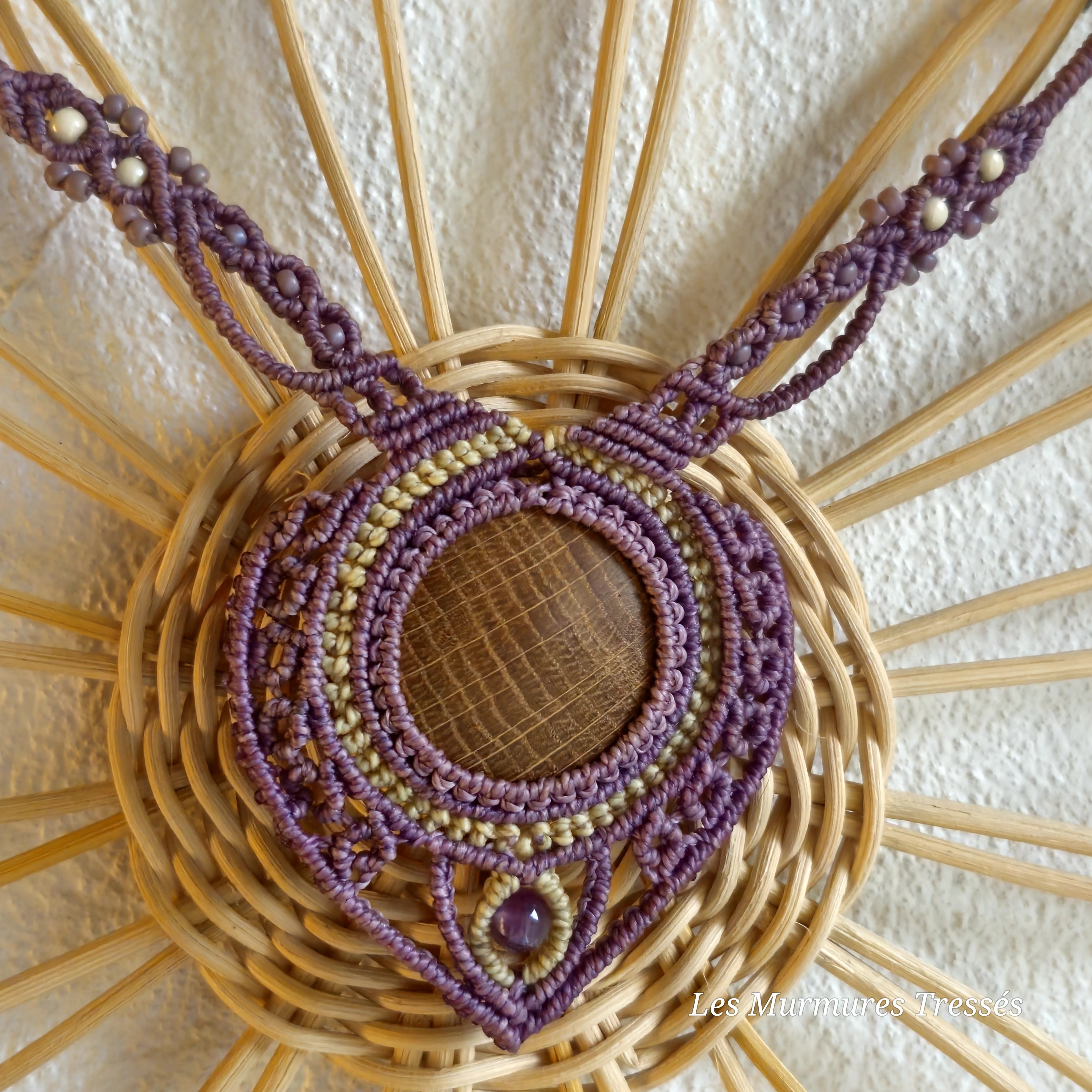 Ce collier célèbre la rencontre entre le bois des Ardennes et l’améthyste, tissé dans une douce harmonie de fils mauve et vanille.