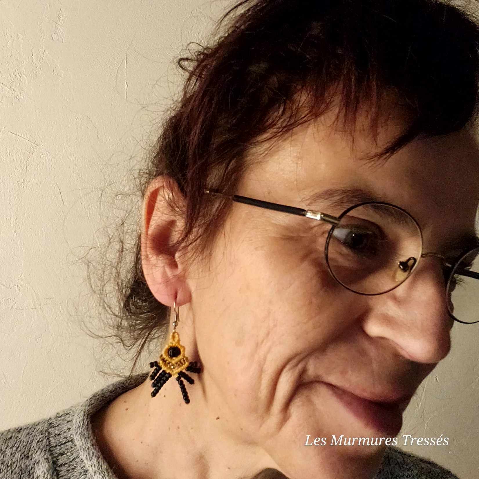 Fils jaunes (1 mm), perles de bois noir et petites rocailles noires.