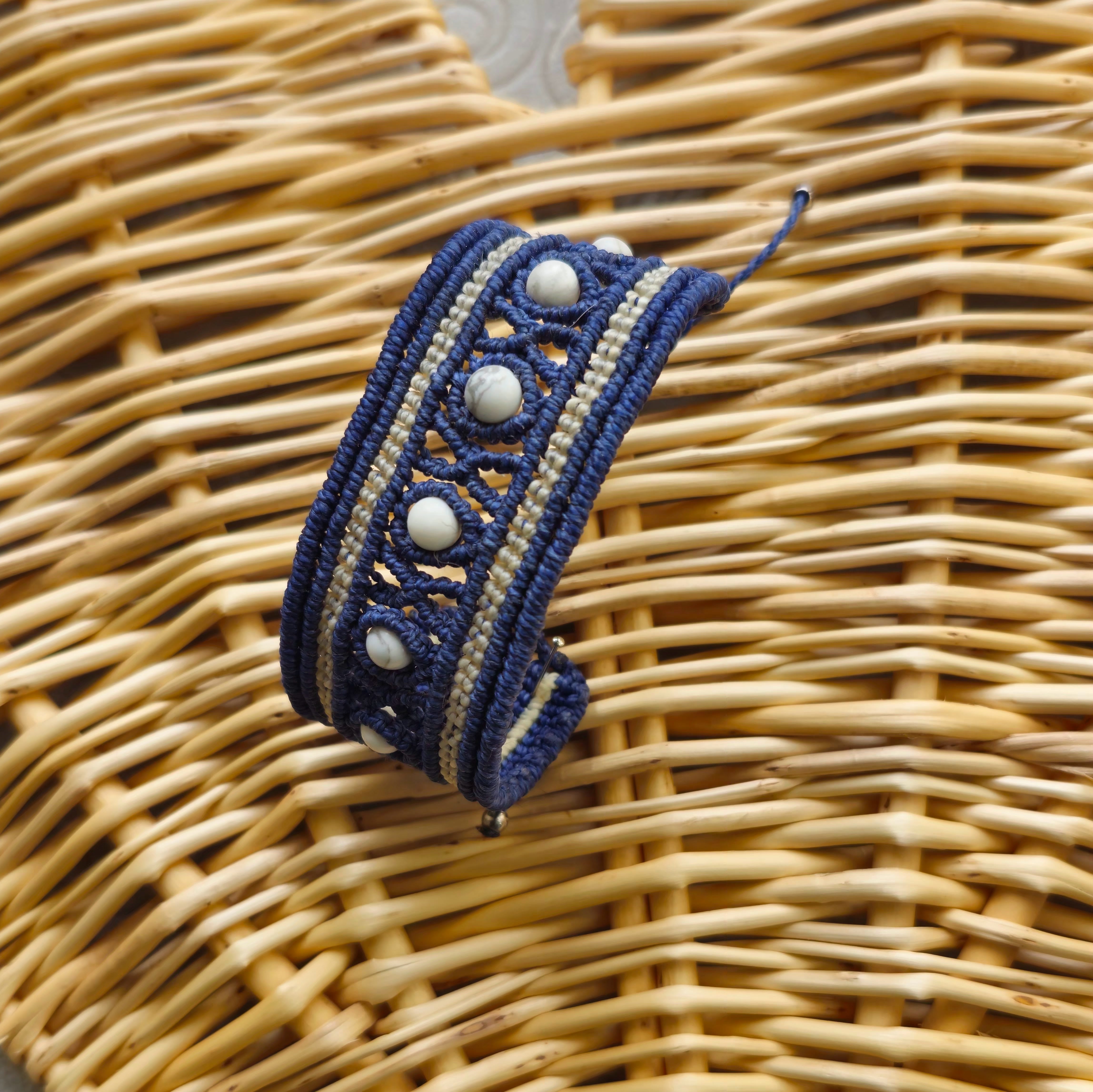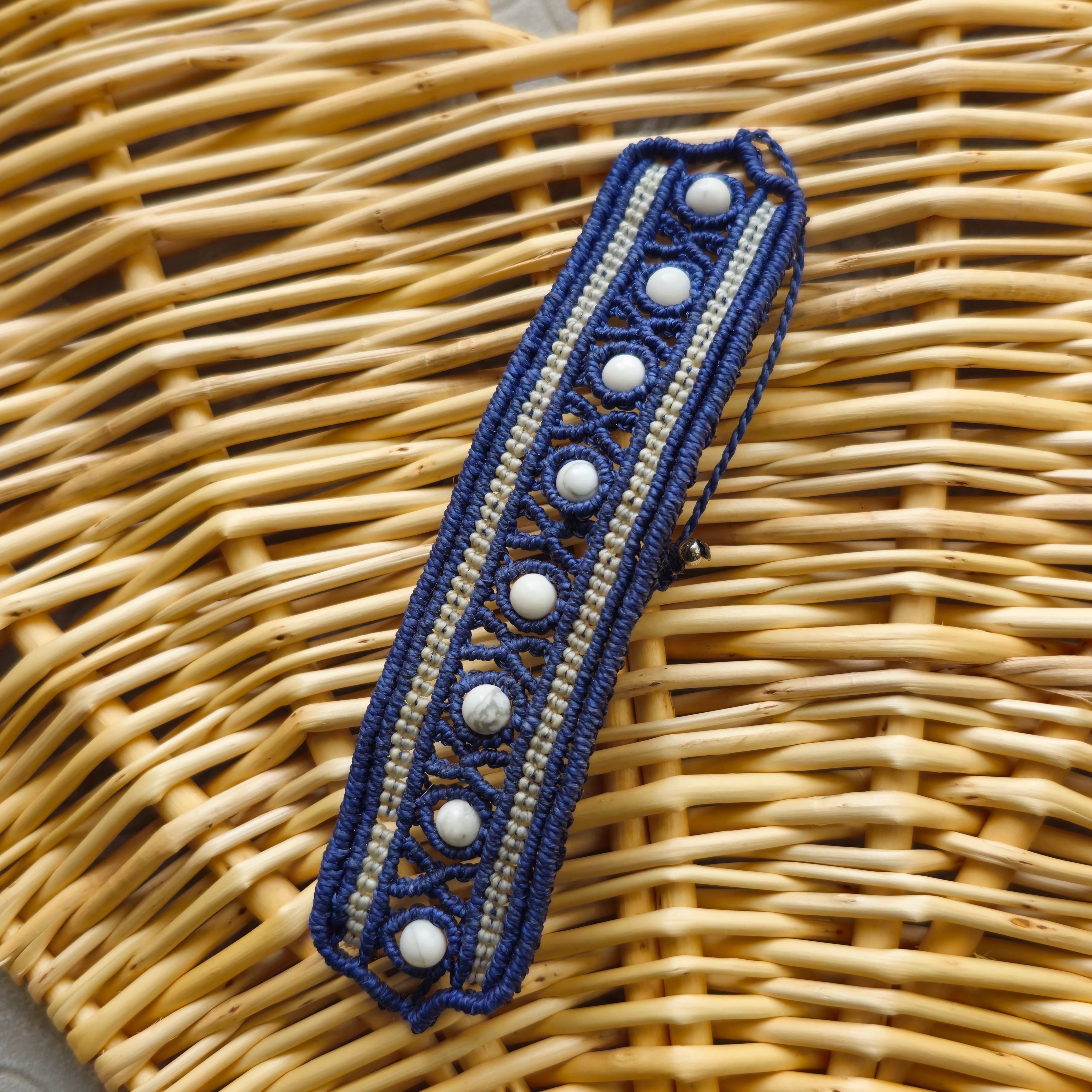 Bracelet artisanal en micro-macramé bleu et sable, orné de perles de Howlite blanche. Fait main dans les Ardennes, création Les Murmures Tressés.