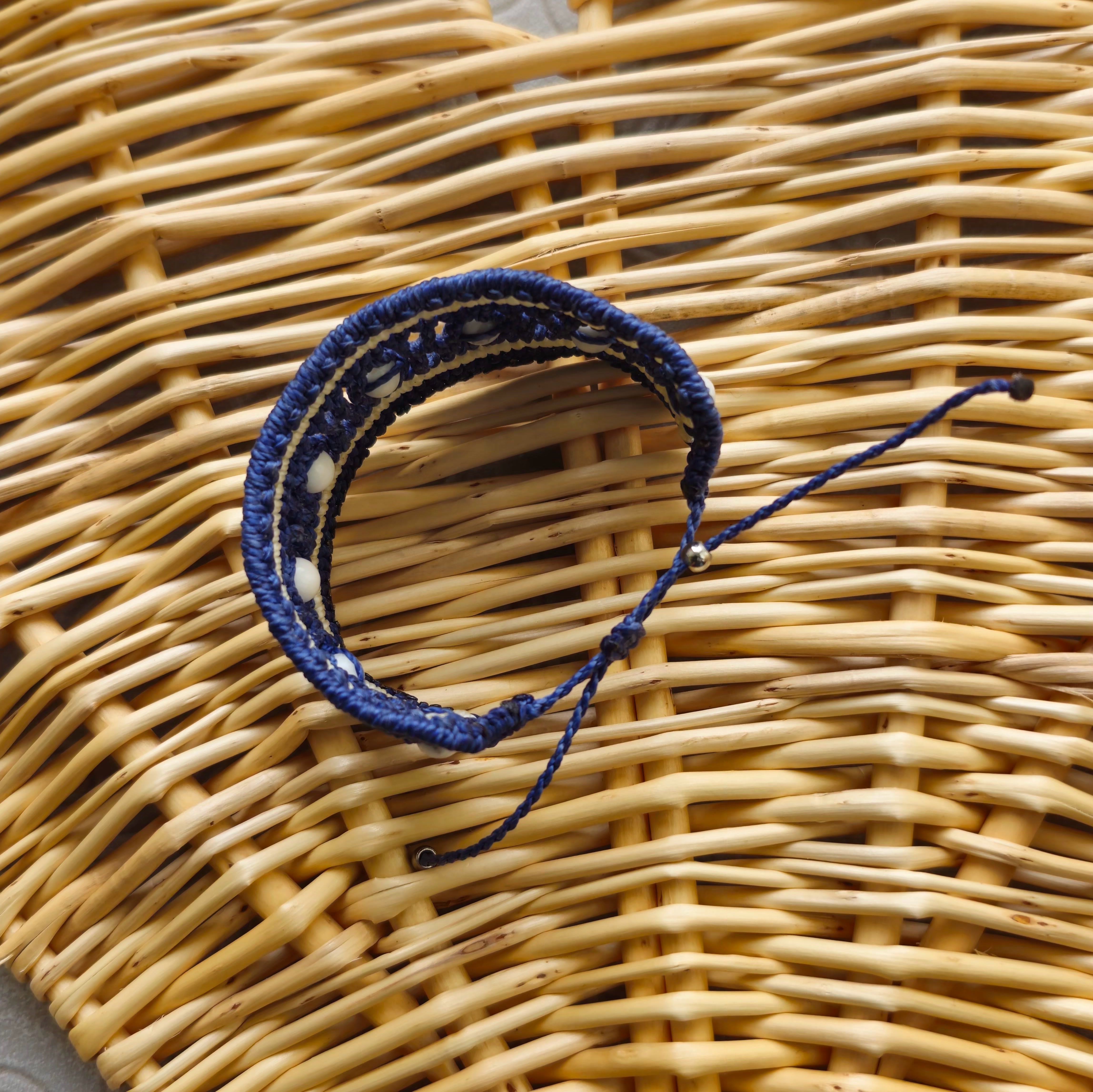 Un bracelet fait main en micro-macramé, où les fils bleu nuit et sable s’entrelacent comme des vagues au bord du rivage.