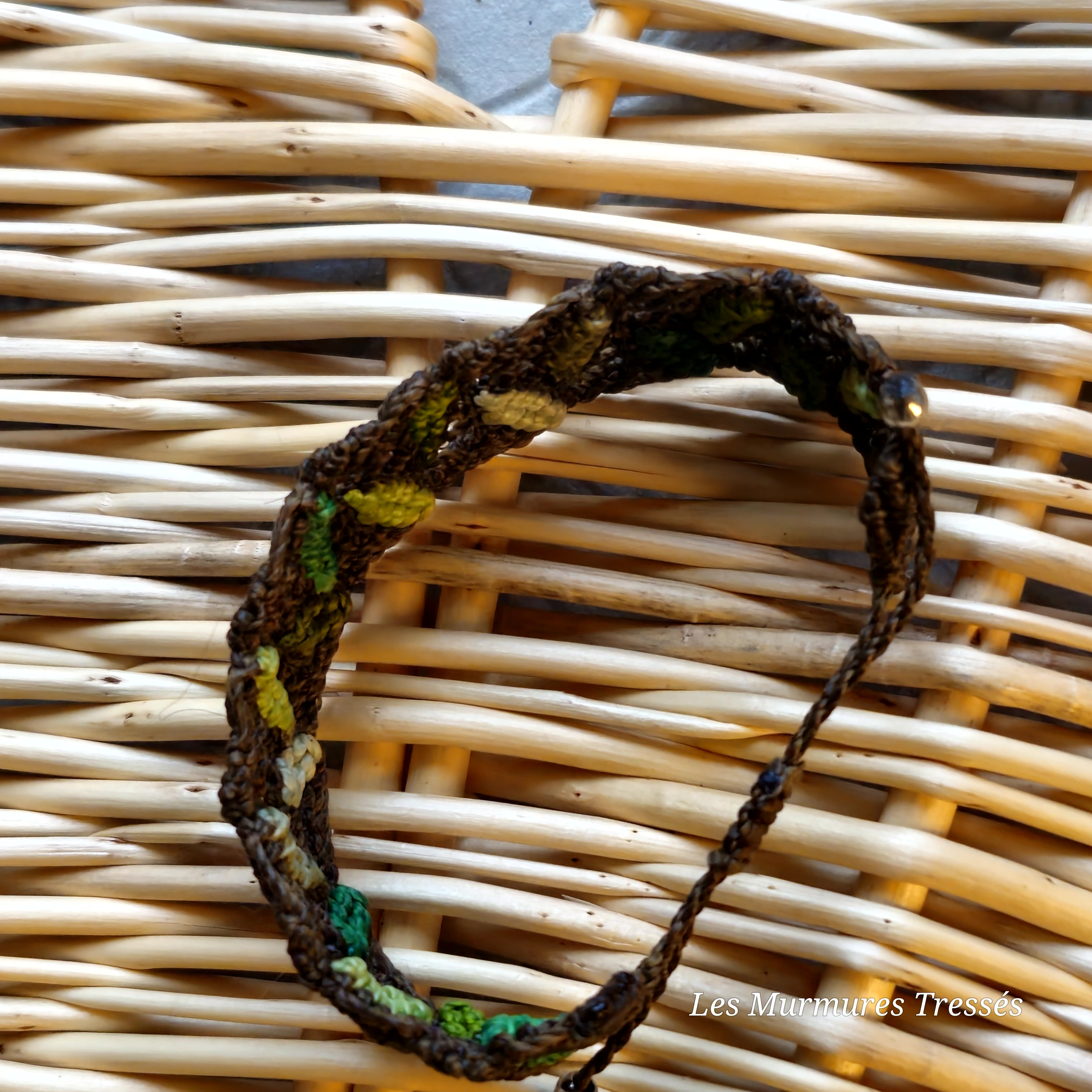 Les nuances de vert s’entrelacent sur un fil chocolat pour un bijou vibrant et naturel.