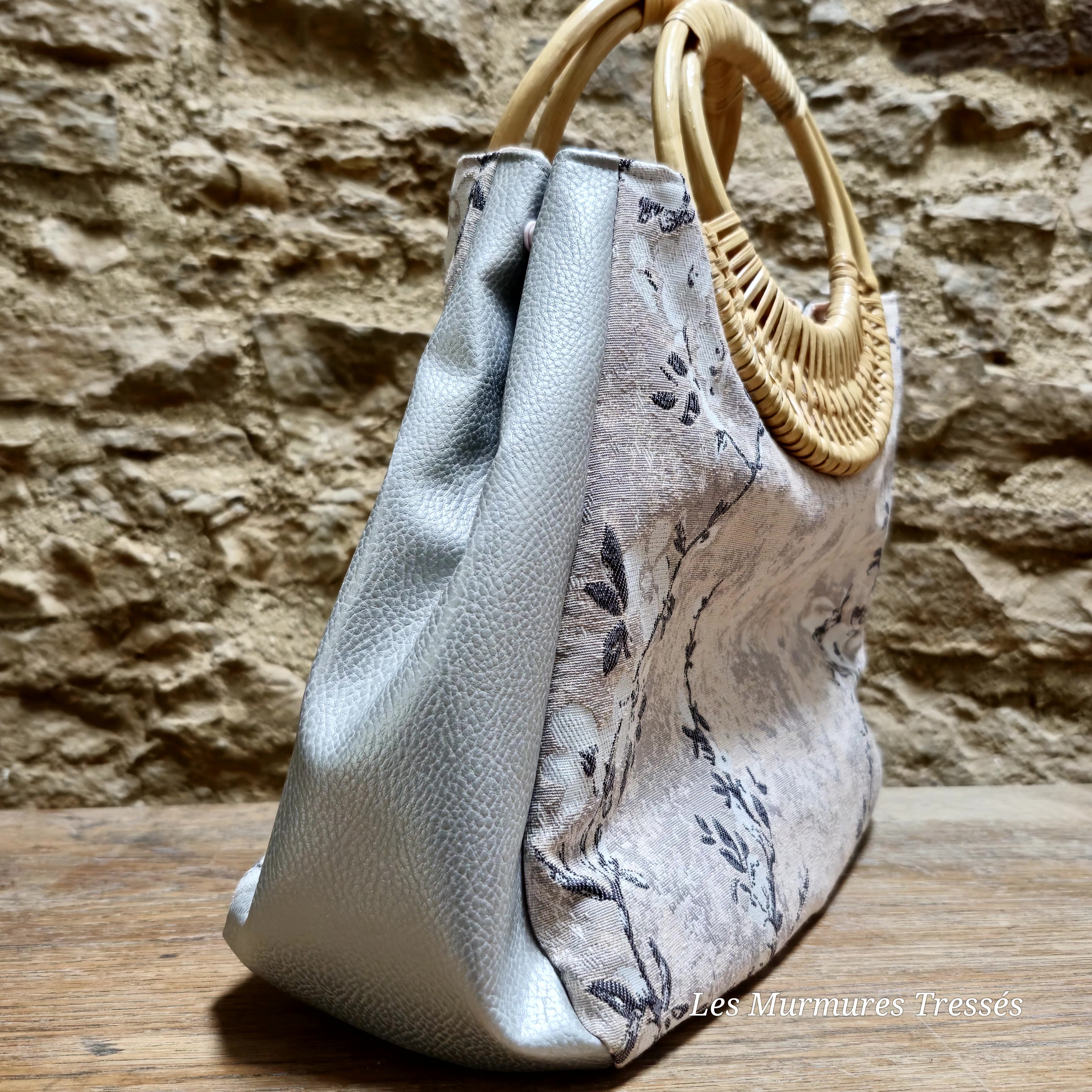 Les côtés en simili cuir argenté ajoutent une note lumineuse et contemporaine, tandis que les poignées en rotin tressé rappellent la chaleur du geste artisanal.
