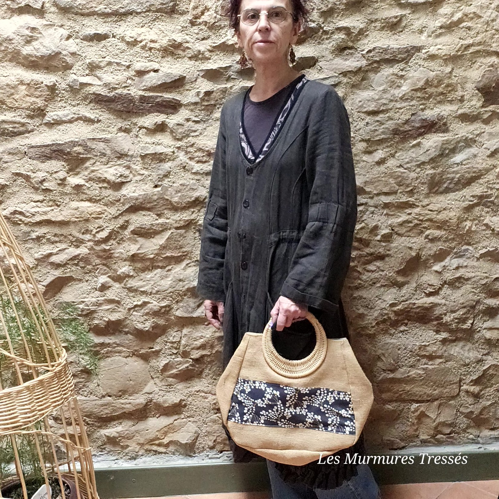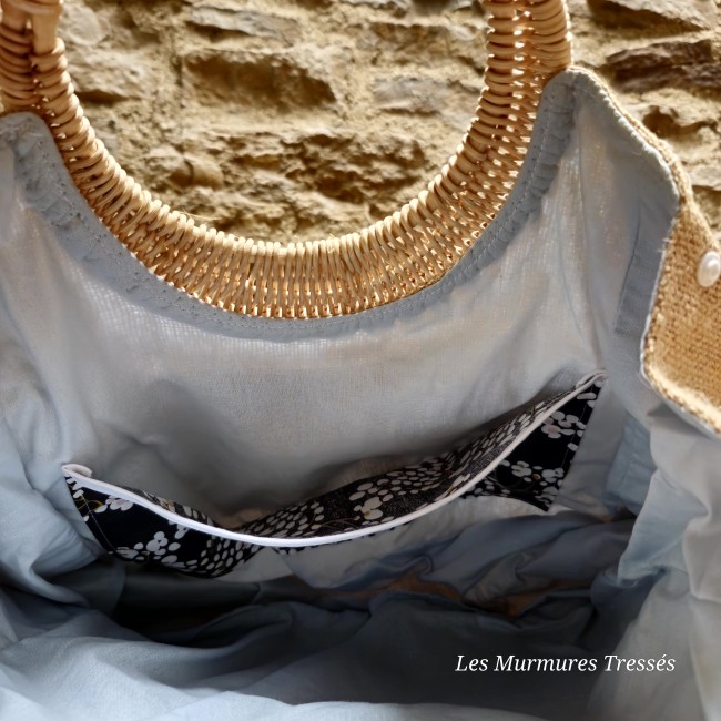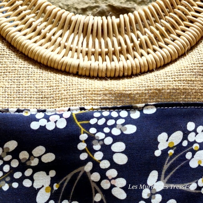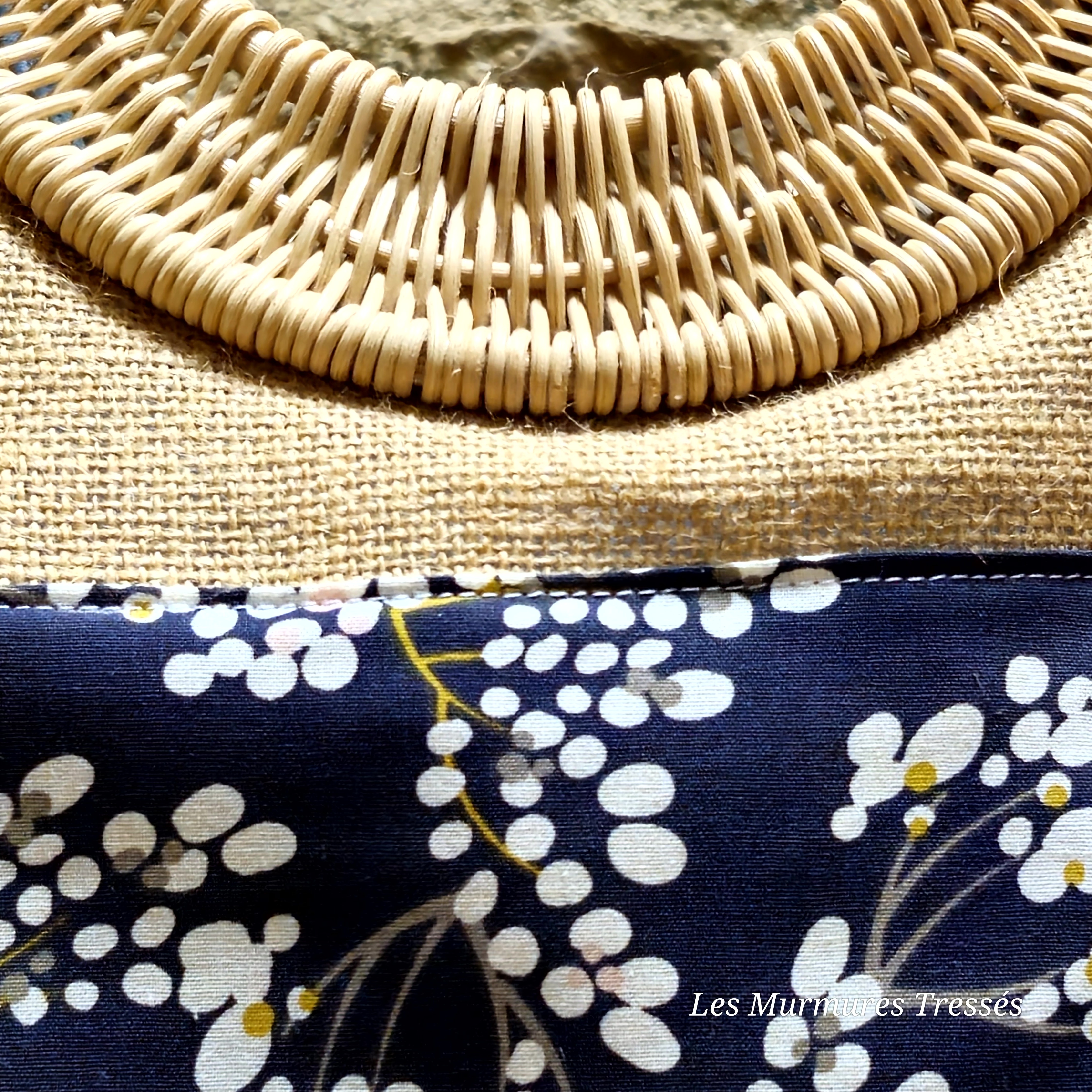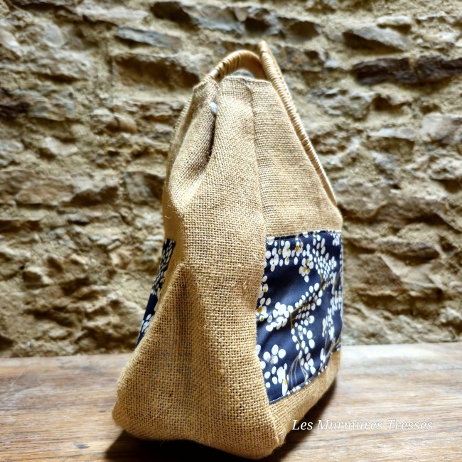 Son corps en toile de jute naturelle lui confère une allure rustique et chaleureuse, tandis que le tissu coton bleu marine à petites fleurs blanches, présent à l’extérieur apporte une touche romantique et délicate.