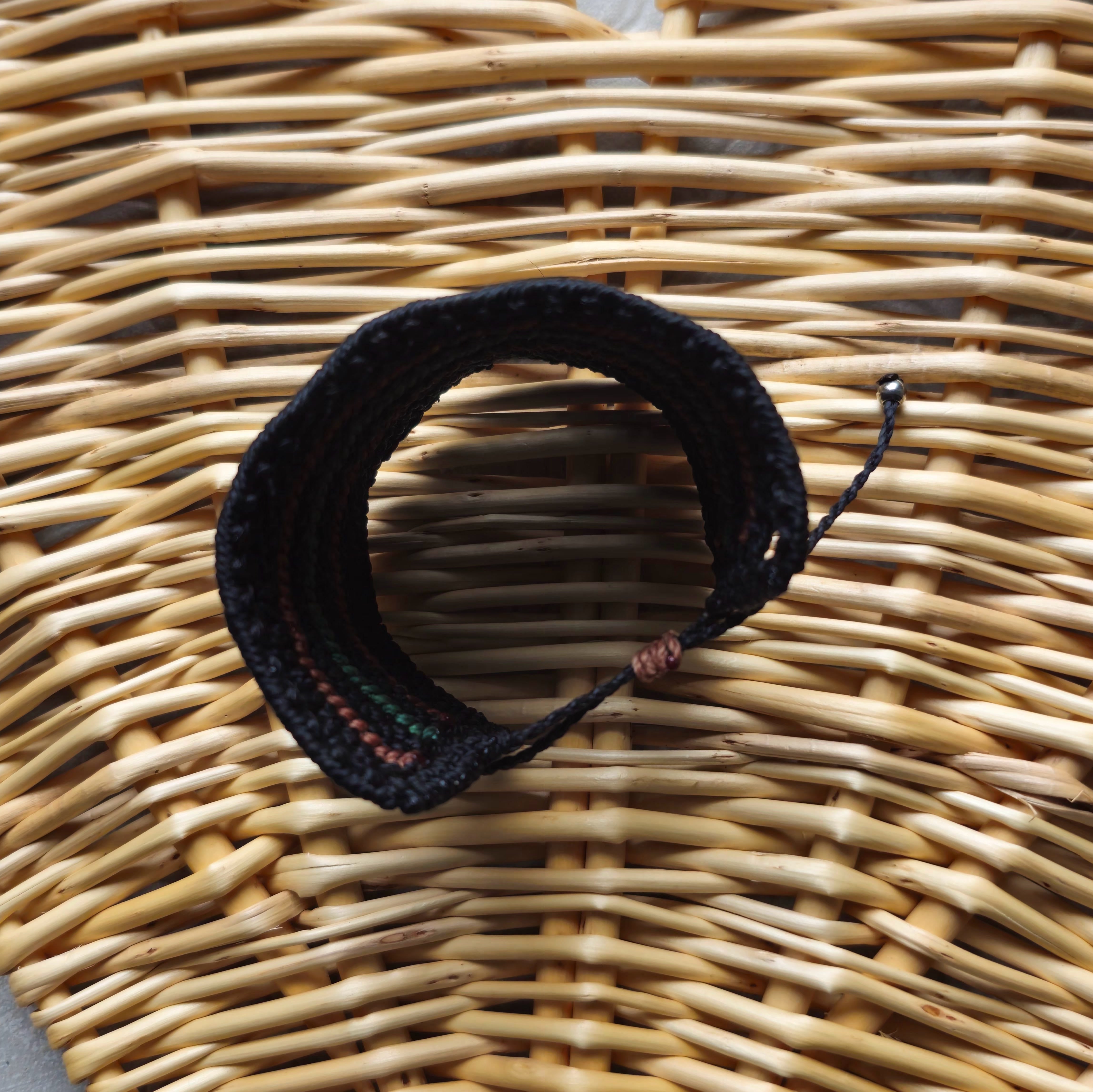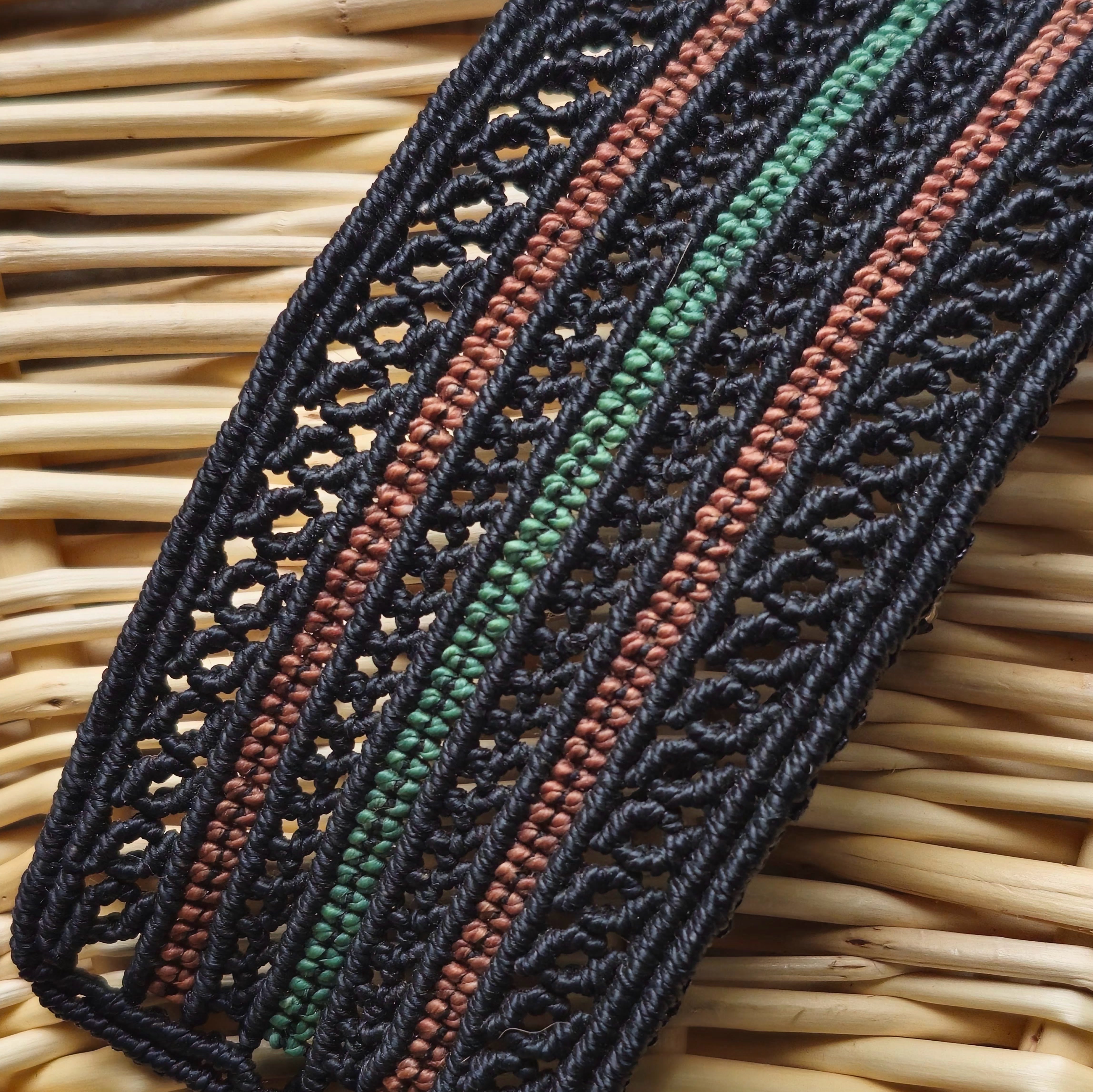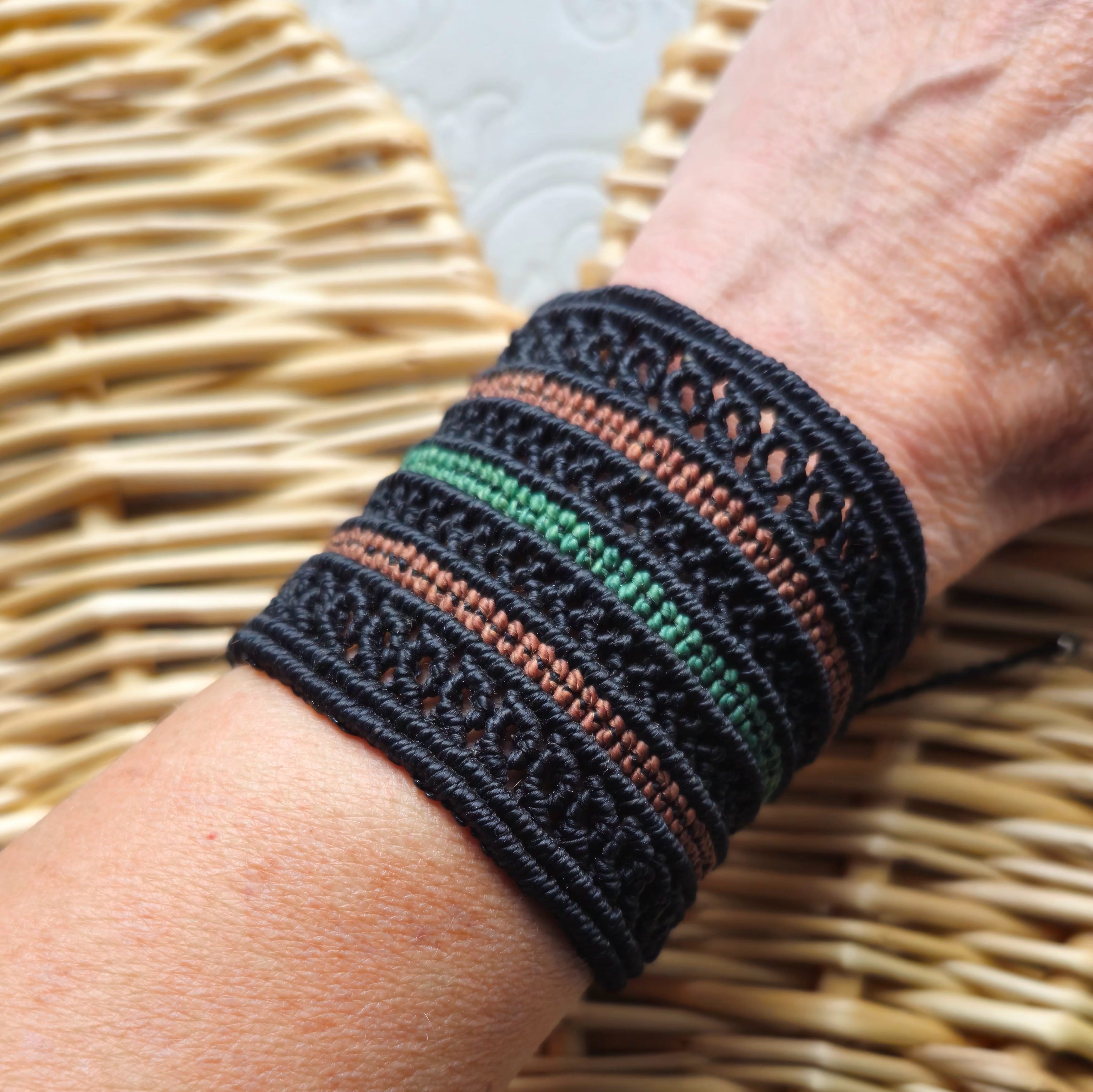 Une manchette tissée de contrastes : le noir profond souligne la chaleur du brun et une touche de vert forêt vient rappeler la mousse au pied des arbres. Un bijou à l’esprit nature et force tranquille.
