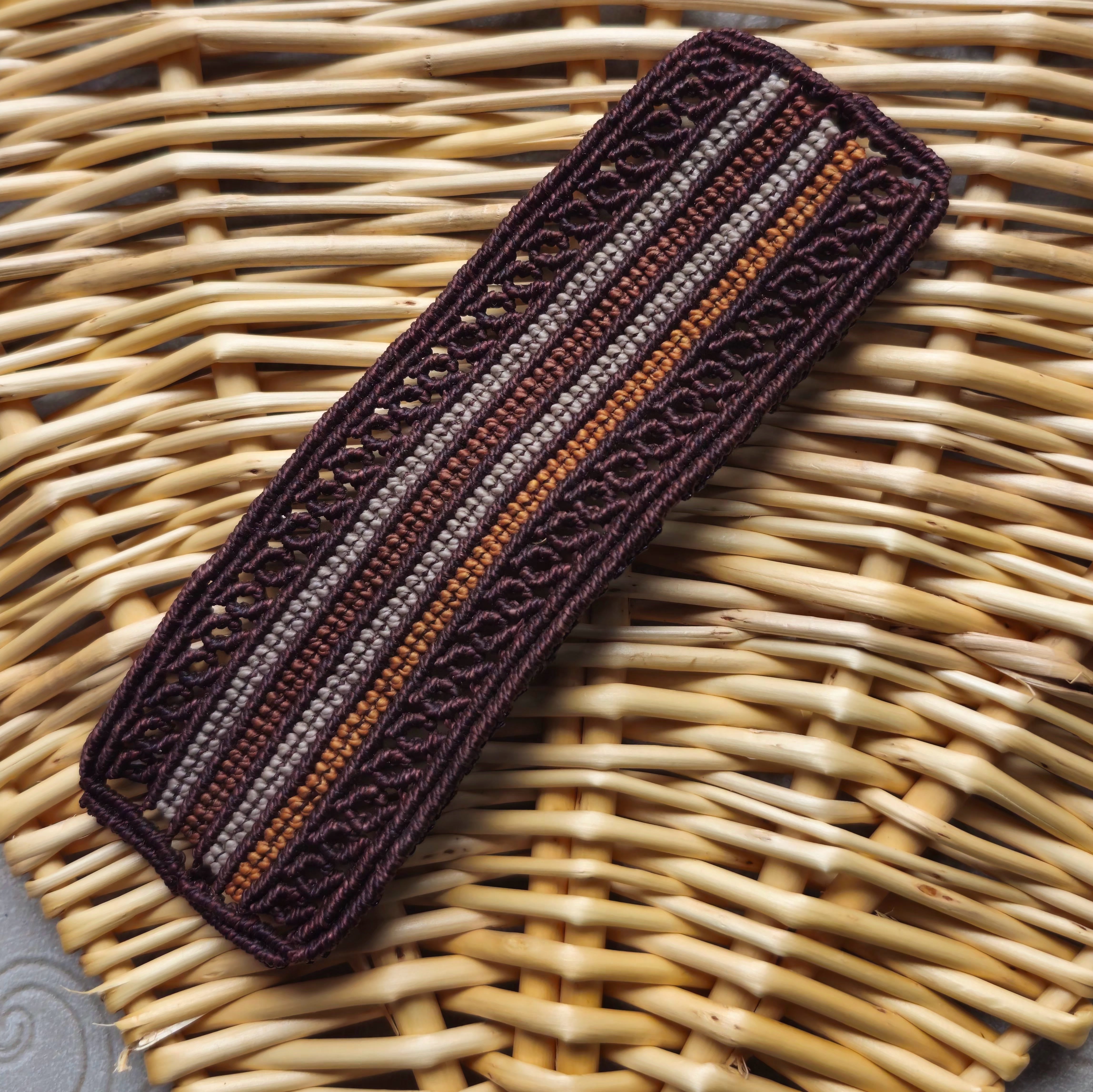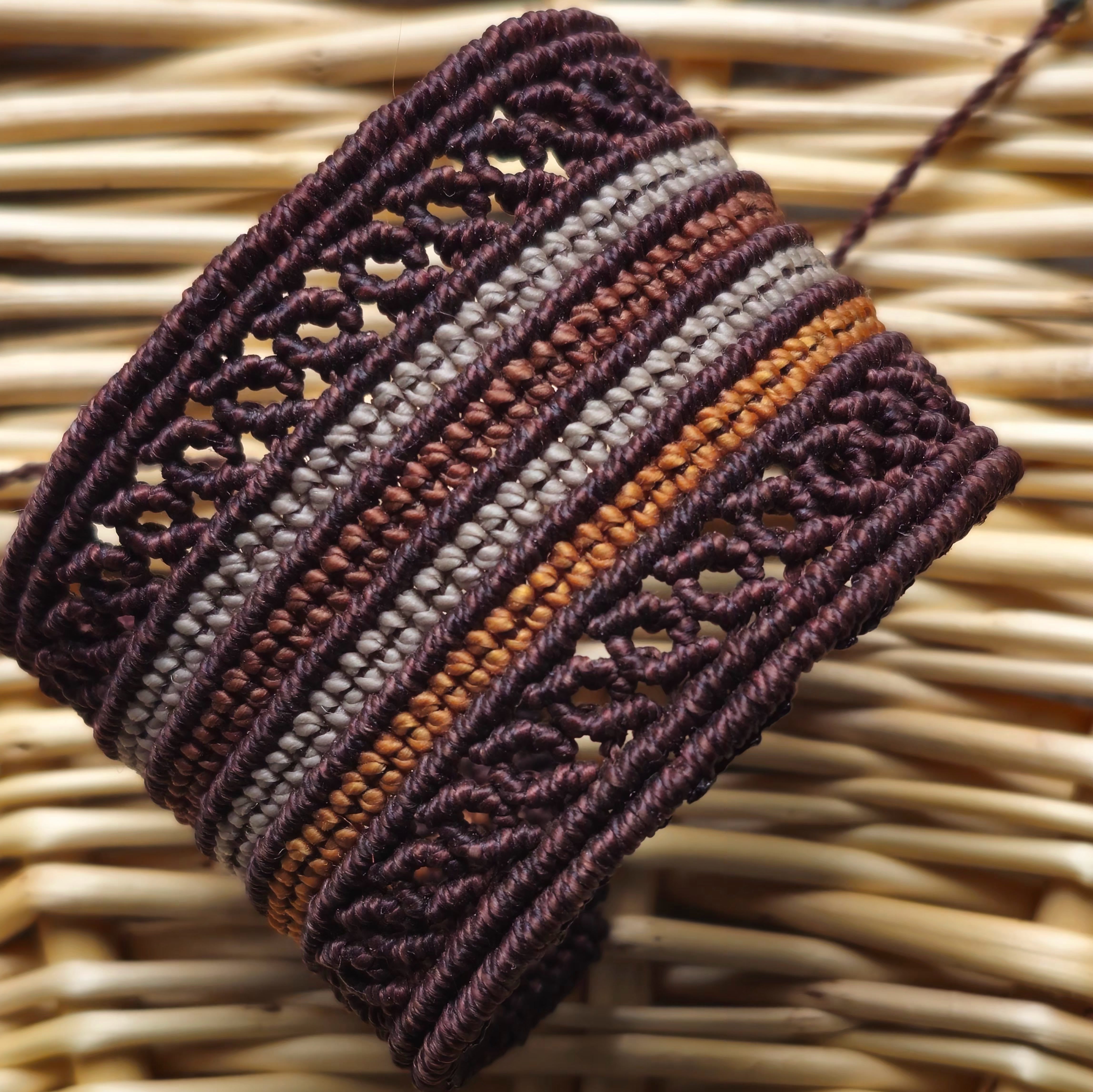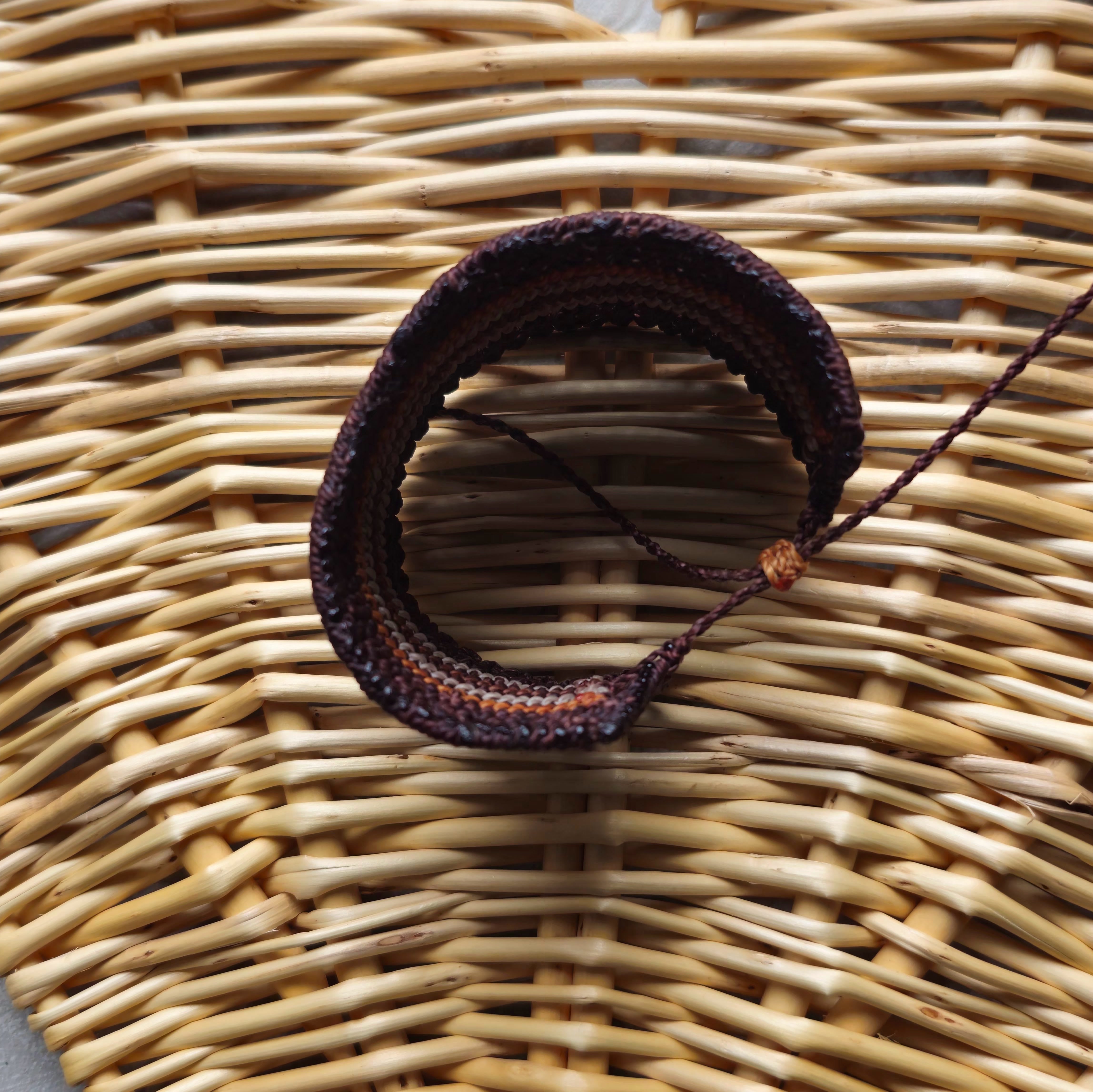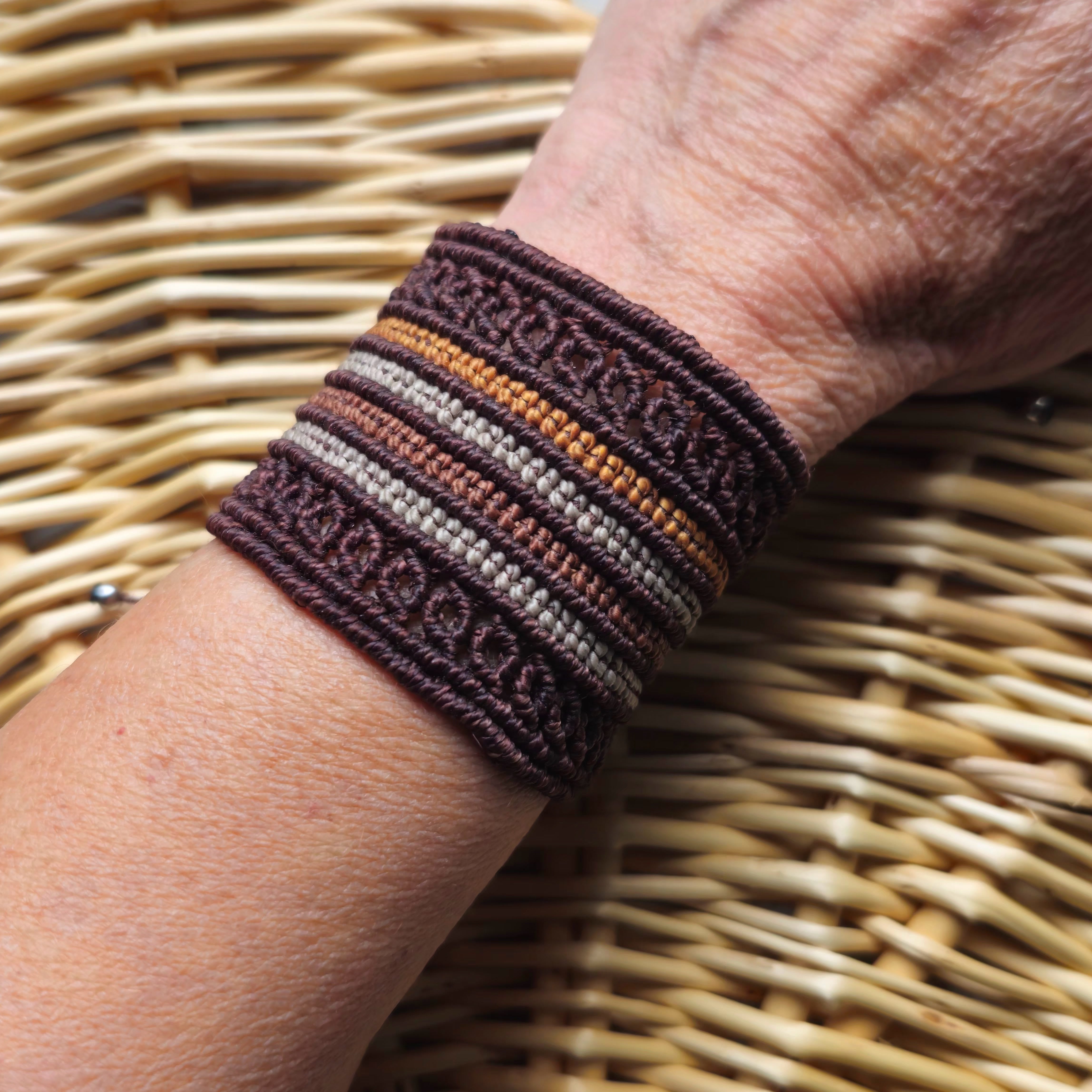 Une touche chaleureuse autour du poignet, comme un thé épicé par une fin d’après-midi d’automne. Les tons chocolat, orange, auburn et écru s’entremêlent dans un jeu de textures.