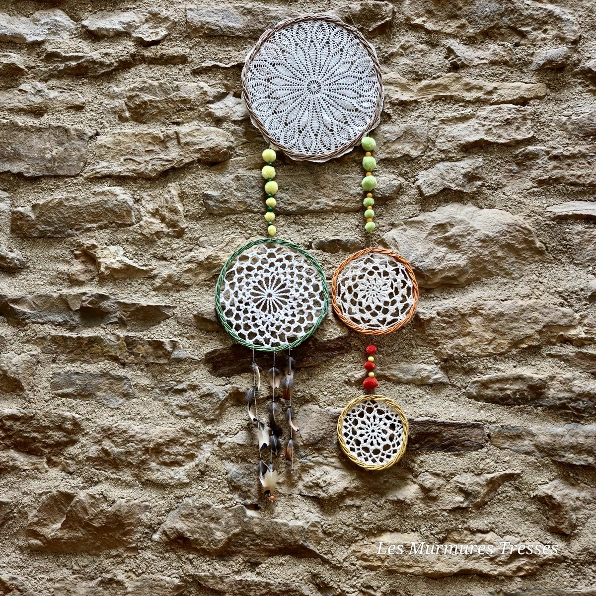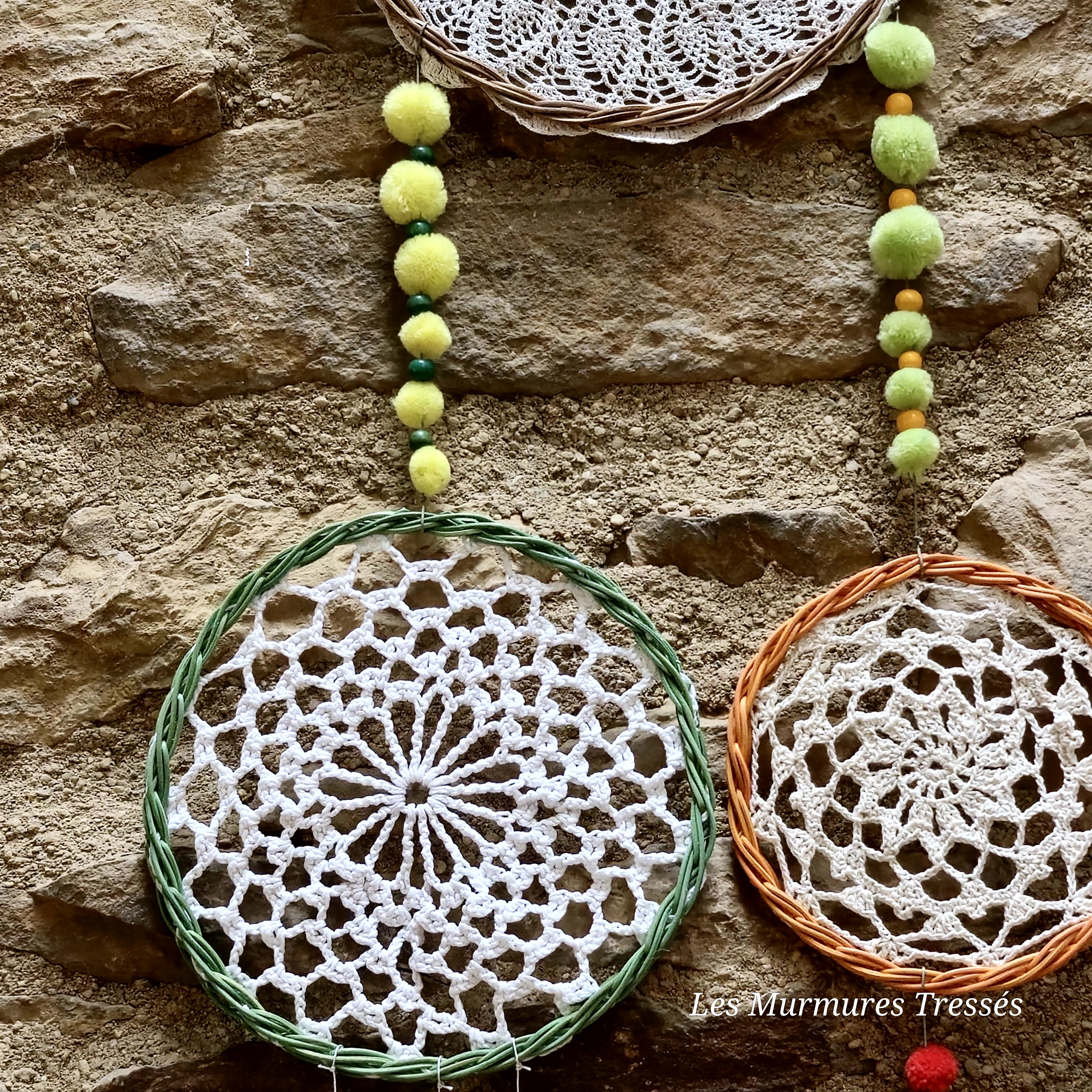 Chaque napperon de cet attrape-rêves a connu une autre vie — peut-être sur le buffet d’une grand-mère, veillant sur la maison et les souvenirs.