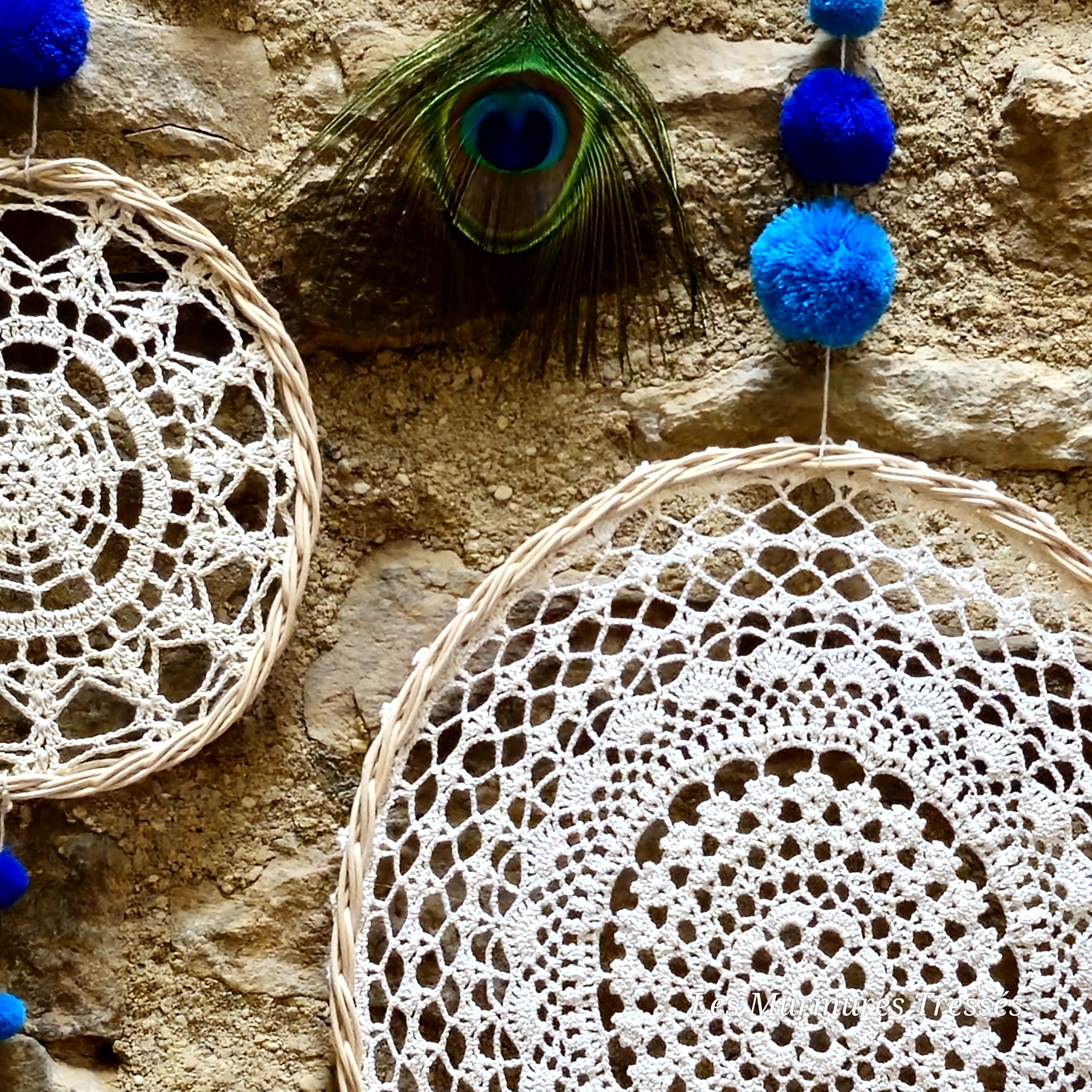 Chaque napperon de cet attrape-rêves a connu une autre vie — peut-être sur le buffet d’une grand-mère, veillant sur la maison et les souvenirs.