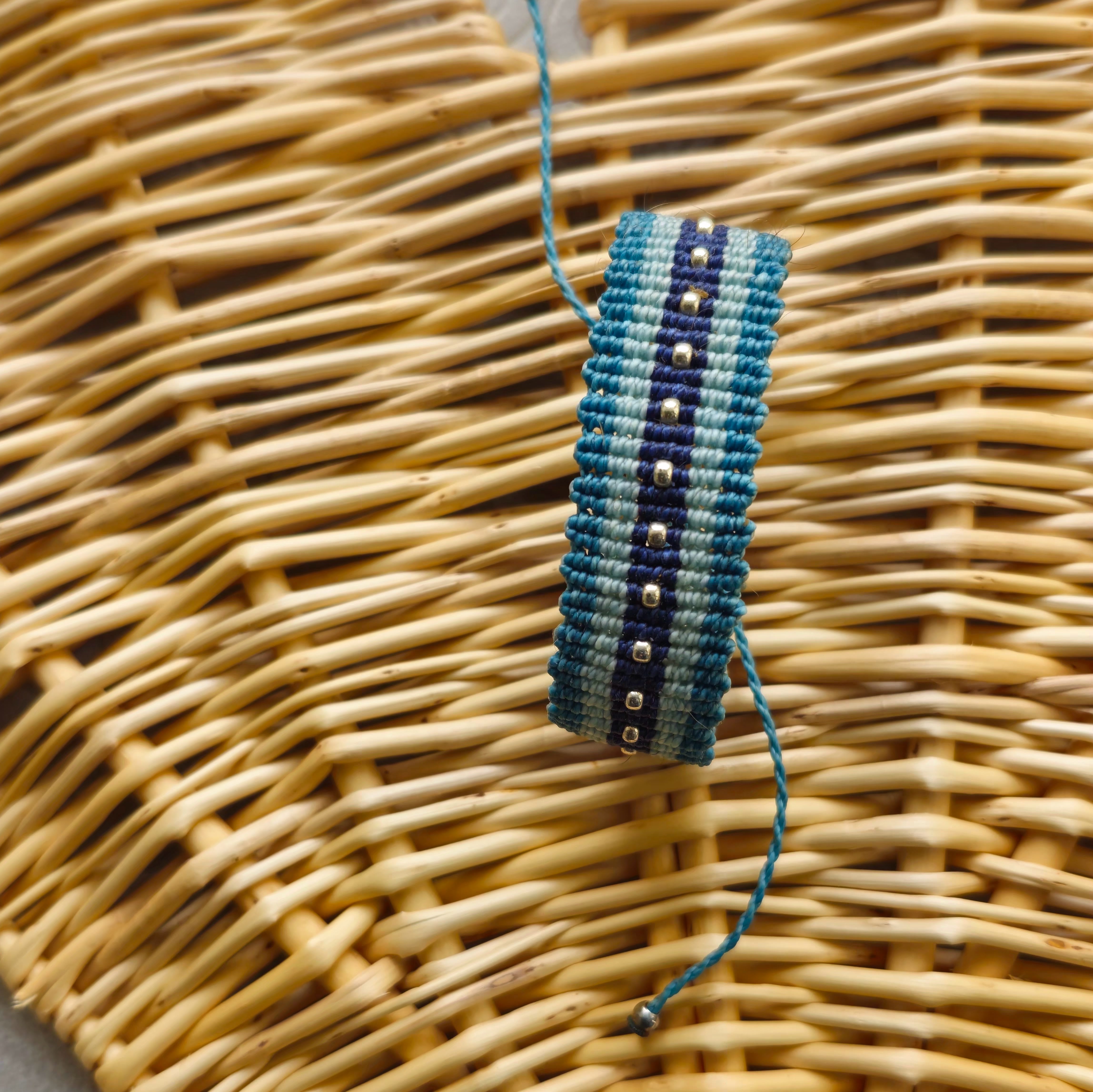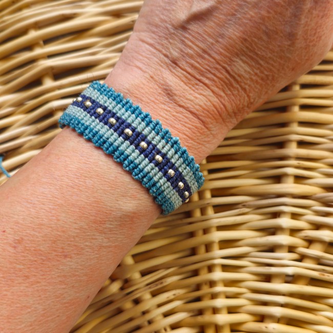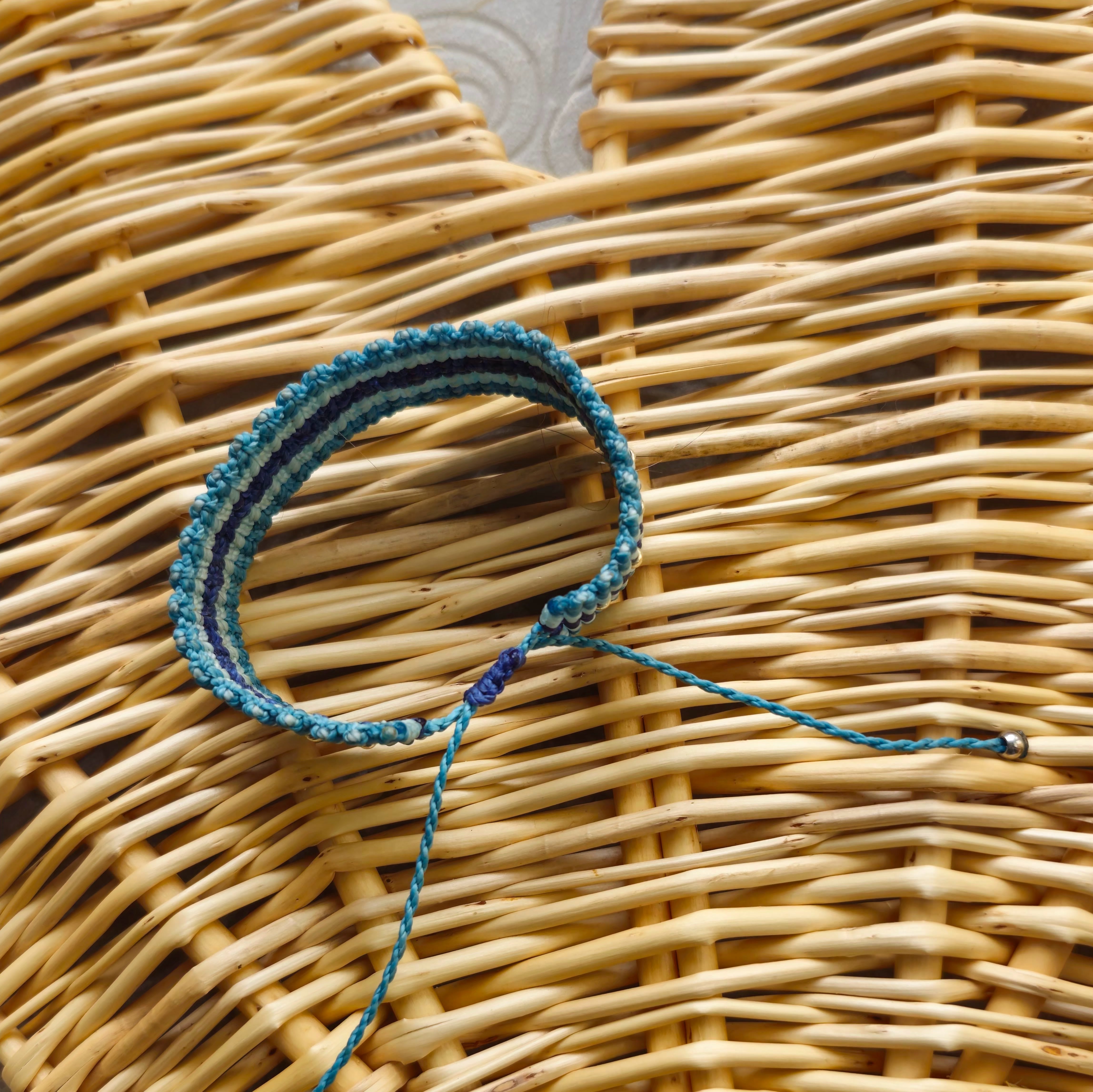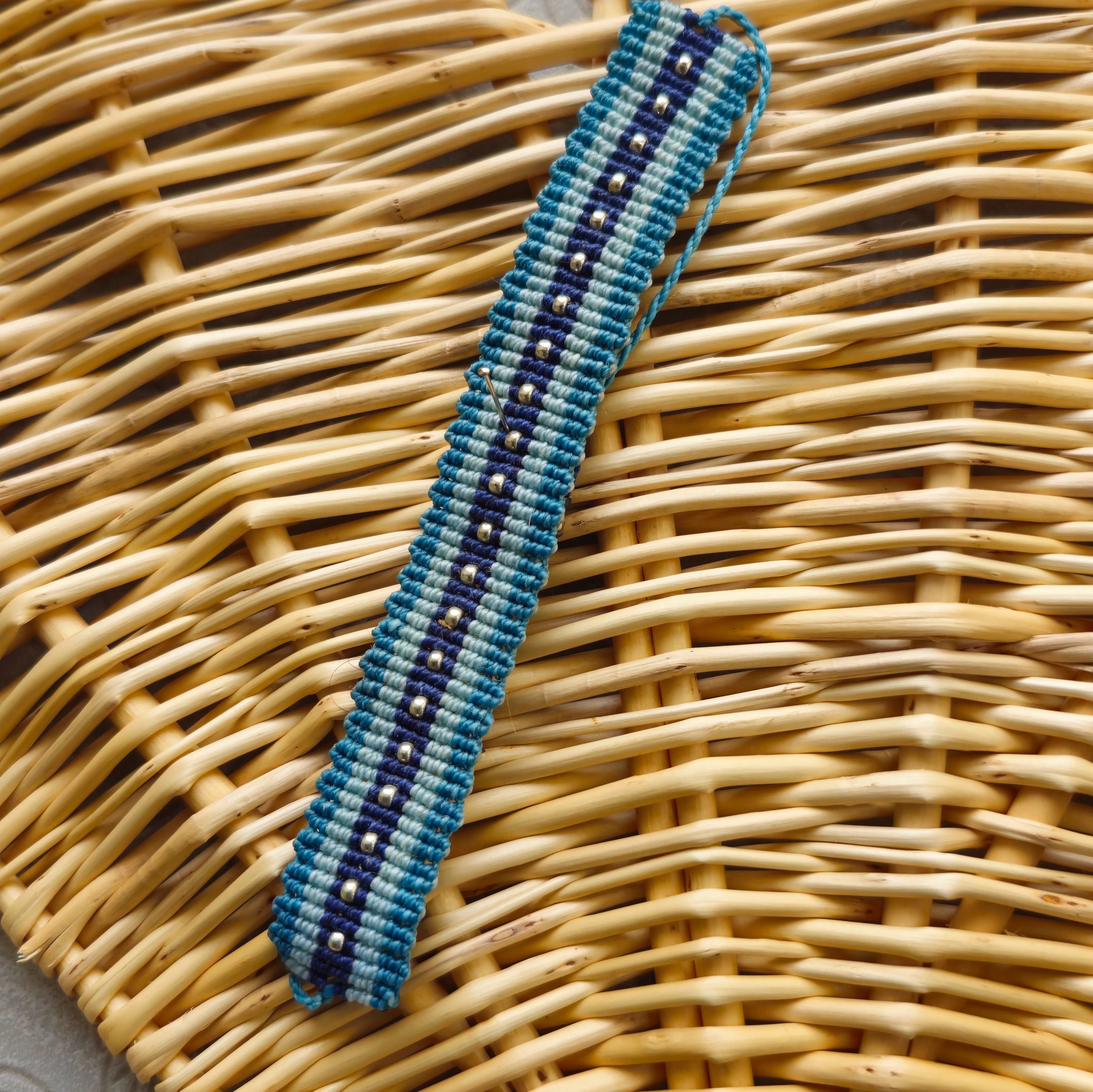 Ce bracelet Ondes Bleues est tissé à la main en micro-macramé avec des fils Linhasita 1 mm dans des tons bleu turquoise, bleu ciel et bleu nuit.