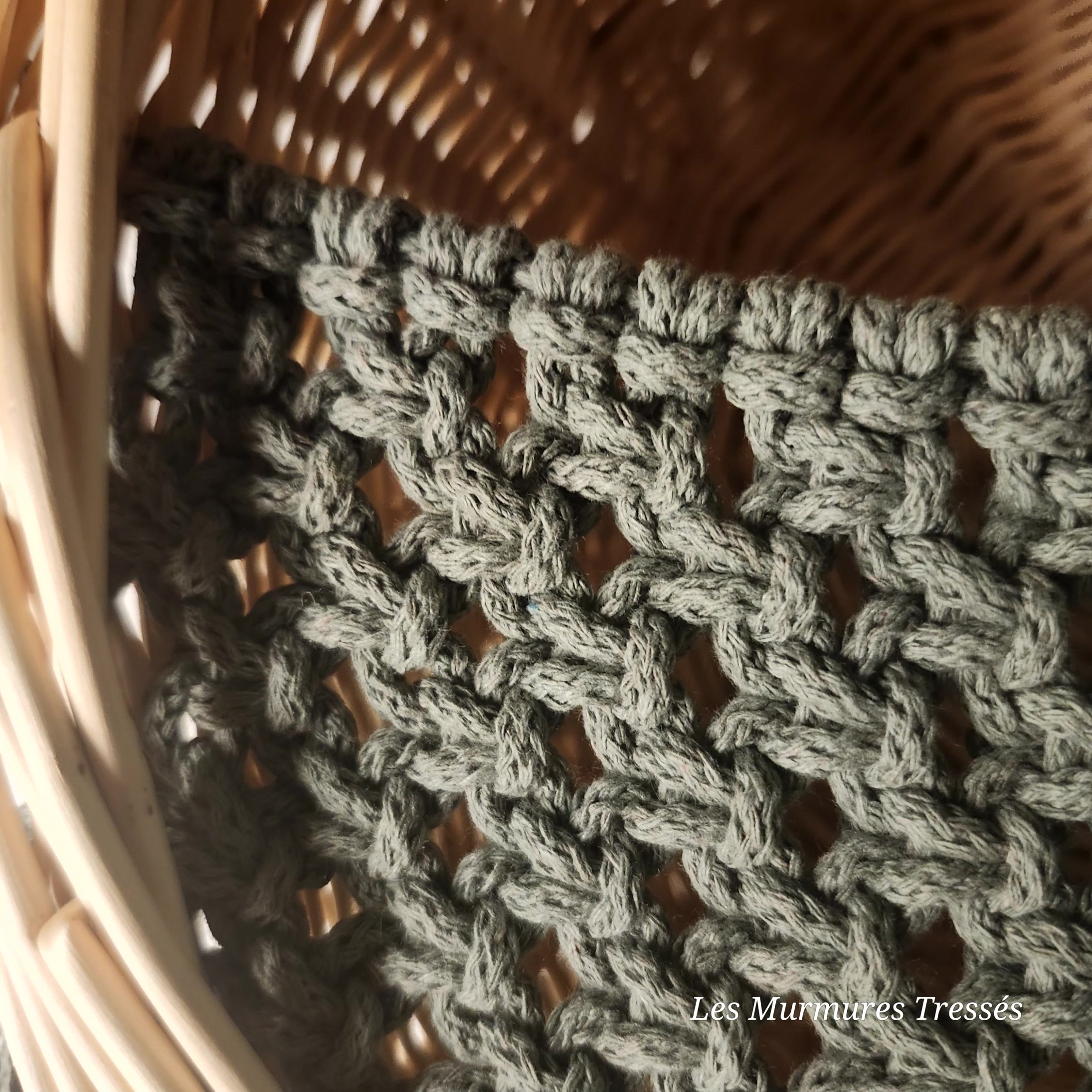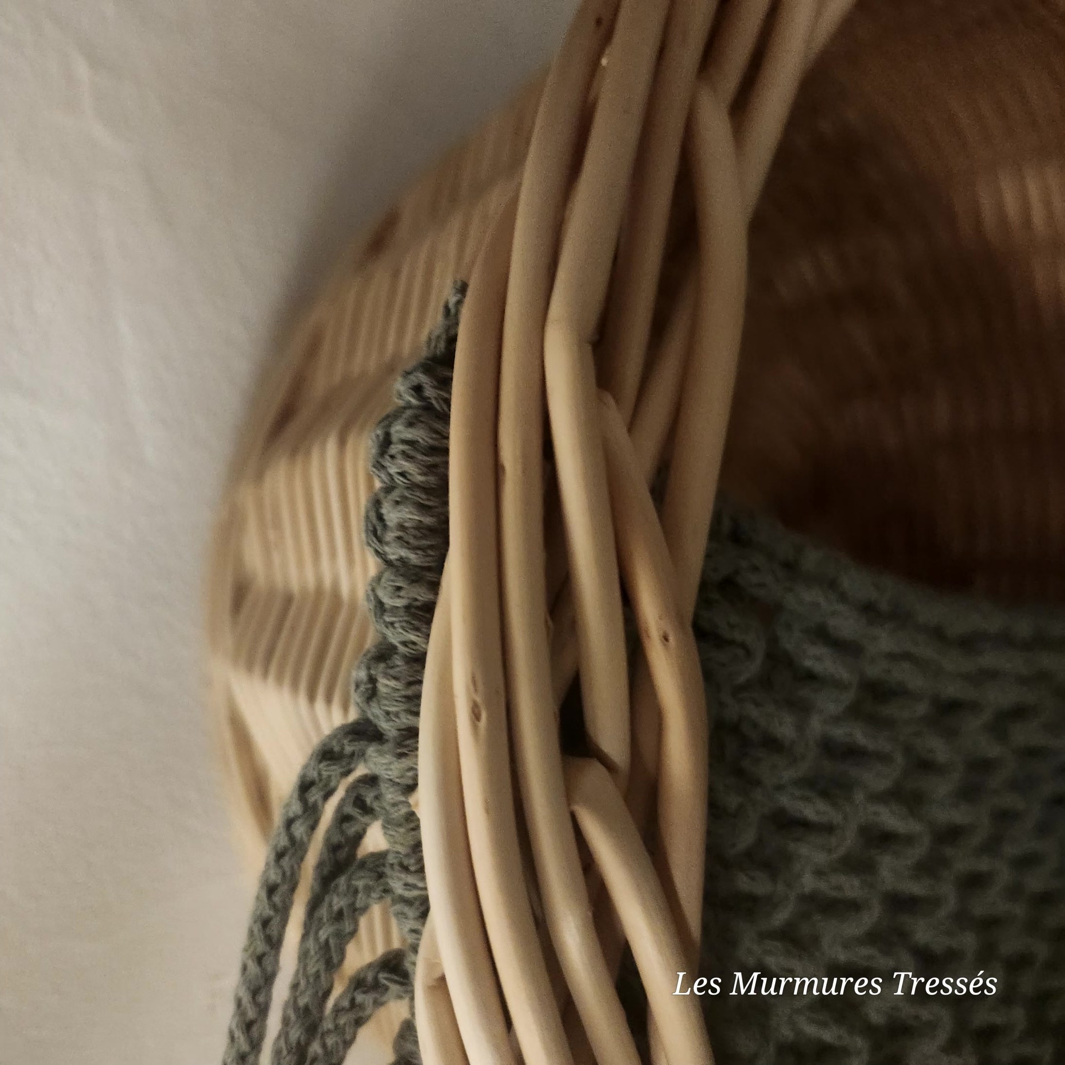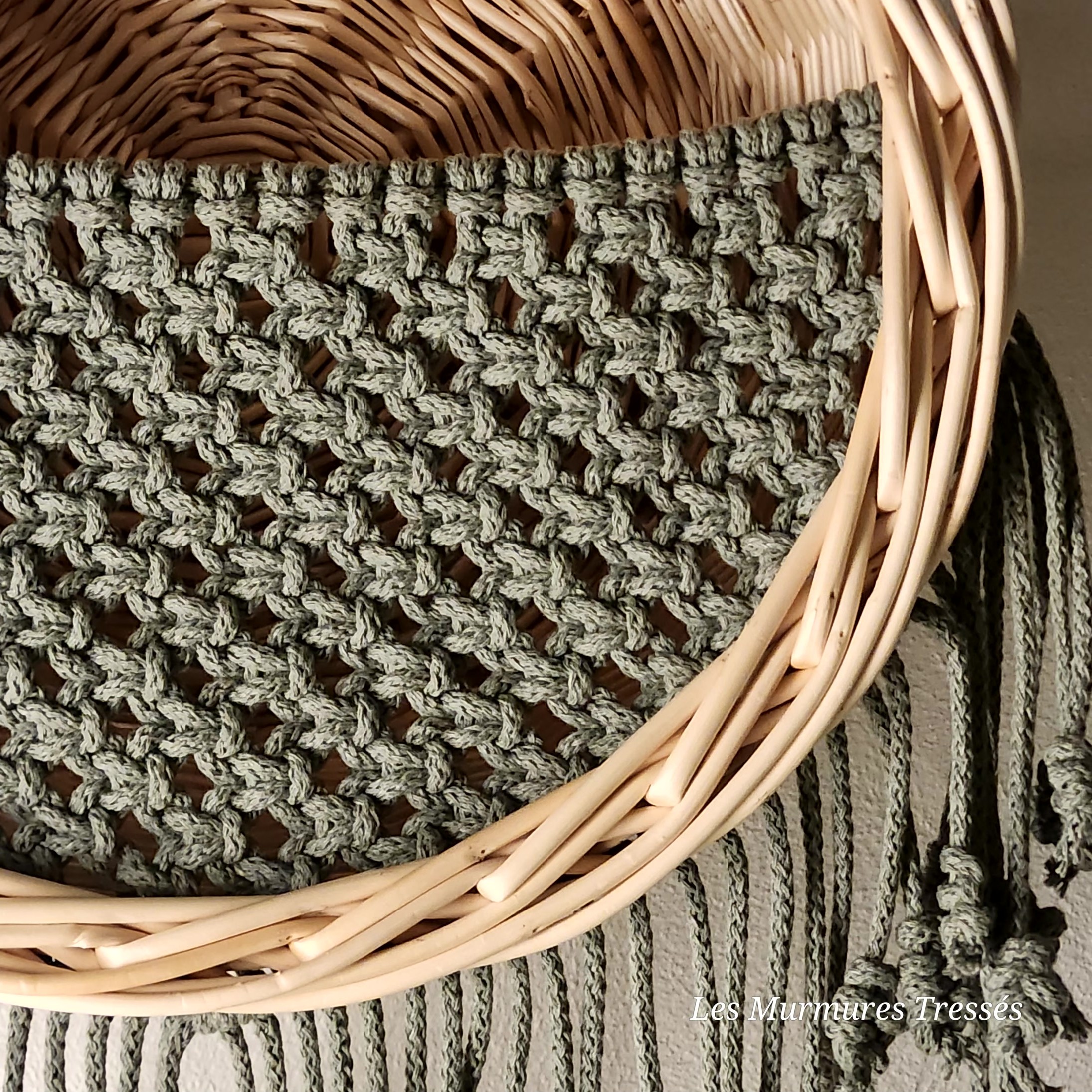 Corbeille tressée en osier blanc – avec filet en macramé vert sauge