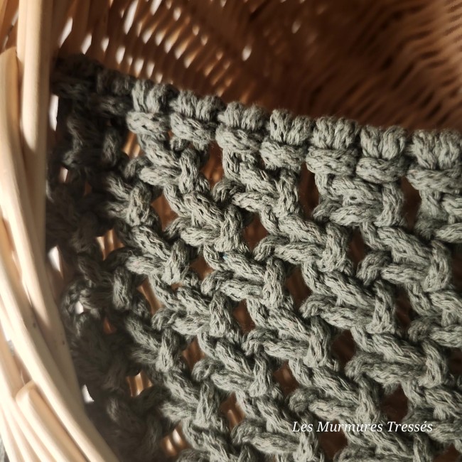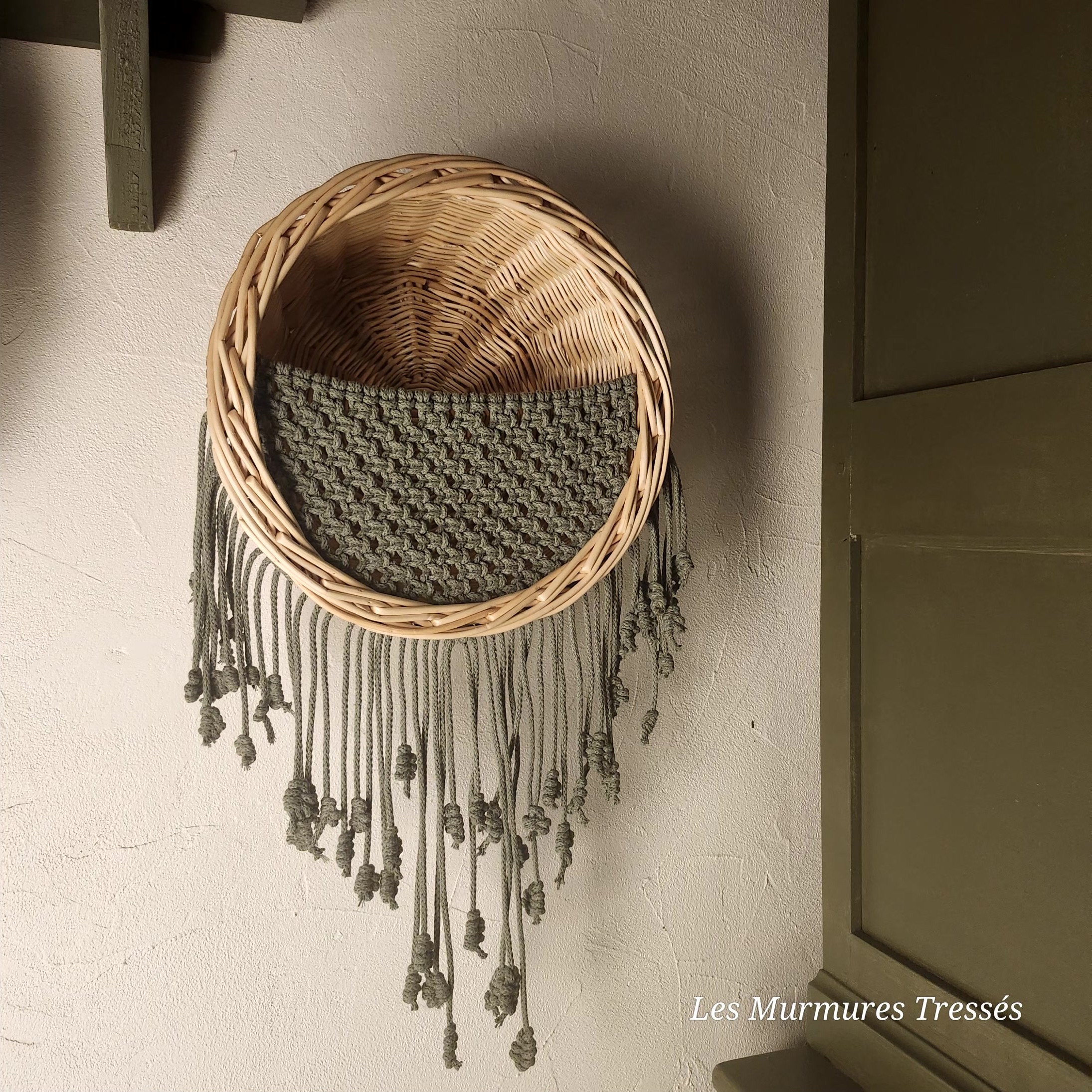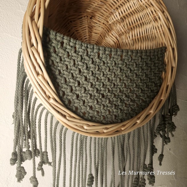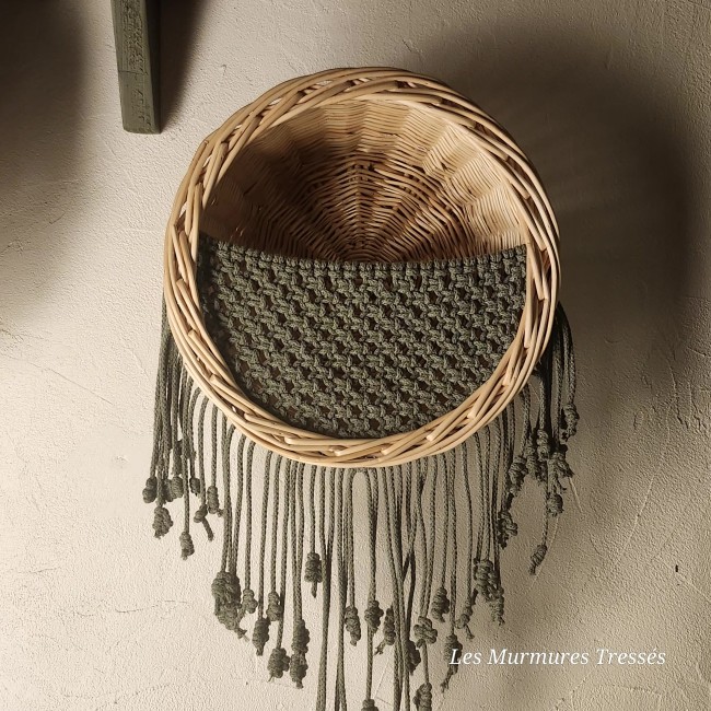 Transformée en corbeille murale de rangement, elle est sublimée d’un filet en macramé tissé en corde de coton naturel.