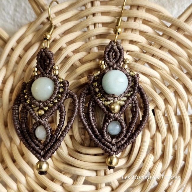 🌸 Boucles d’oreilles micro-macramé “Fleur tressée" marron et perles Aventurine roseLes Boucles D'oreilles
